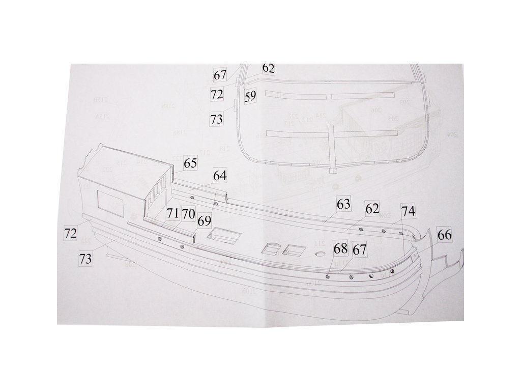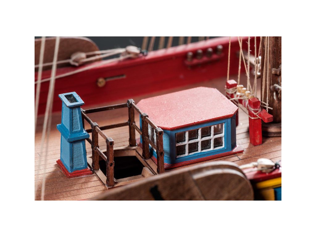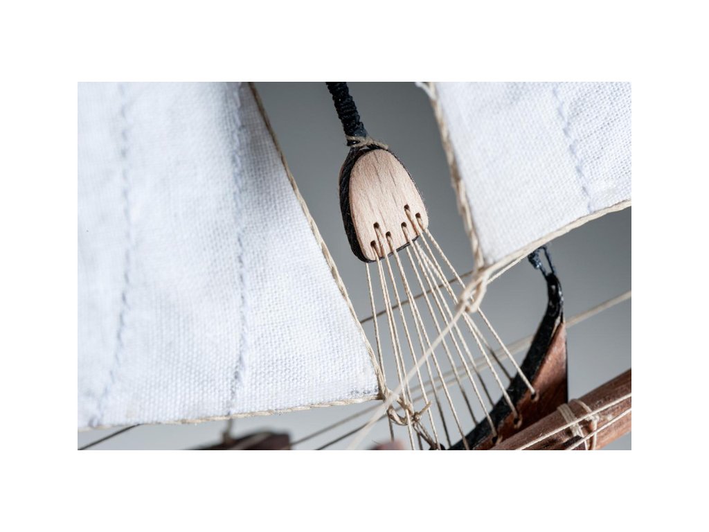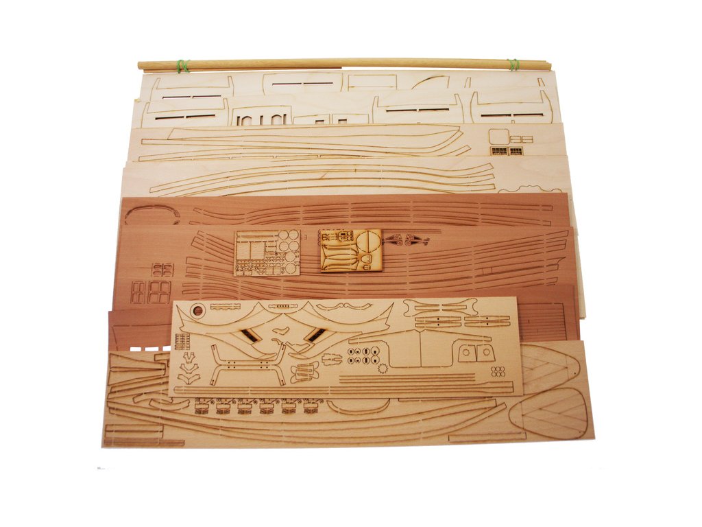 Balení obsahuje laserem vyřezané díly z překližky a kompletní dřevěné součásti, mosazné součásti, prkna a lišty pro palubu, předtištěné vlajky, látku pro plachtu a dostatek lanoví na celou loď. Sestavení pomáhá návod v češtině a podrobný plán stavby a přesné pokyny ke stavbě v němčině a angličtině.