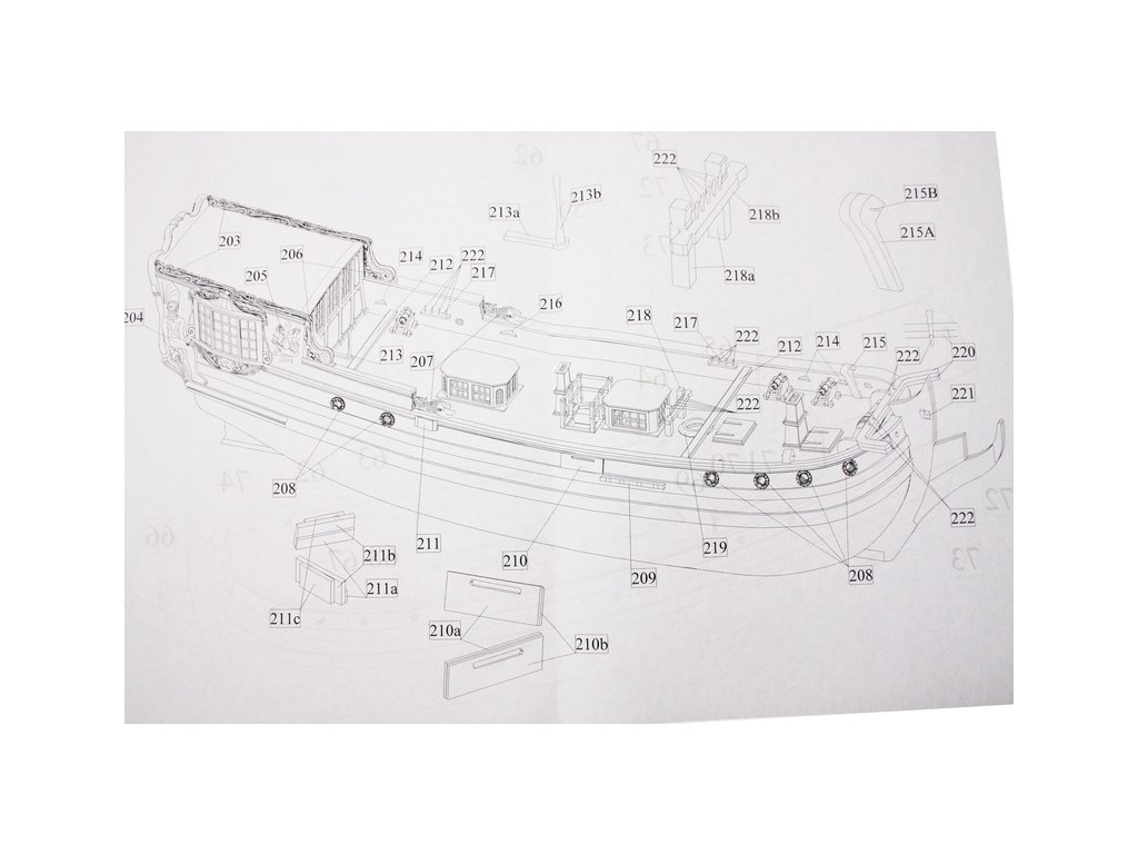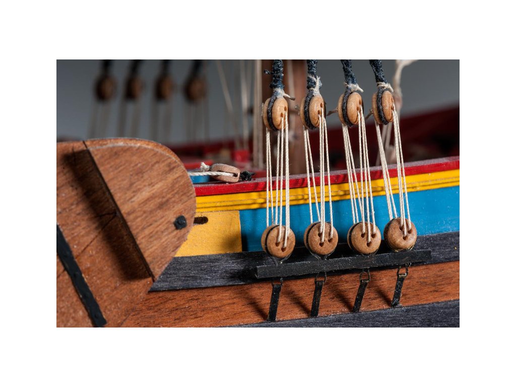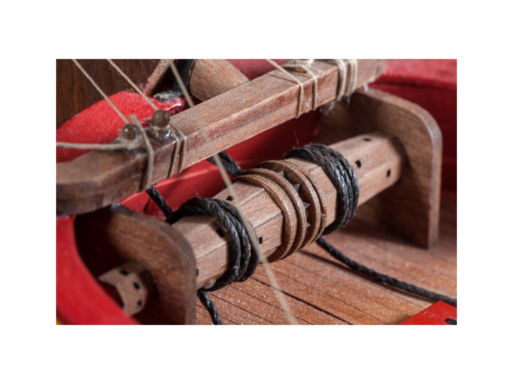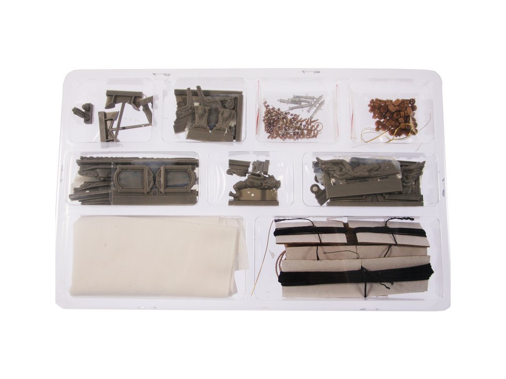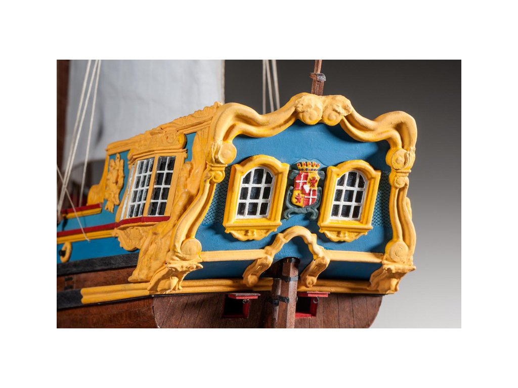 Balení obsahuje laserem vyřezané díly z překližky a kompletní dřevěné součásti, mosazné součásti, prkna a lišty pro palubu, předtištěné vlajky, látku pro plachtu a dostatek lanoví na celou loď. Sestavení pomáhá návod v češtině a podrobný plán stavby a přesné pokyny ke stavbě v němčině a angličtině.