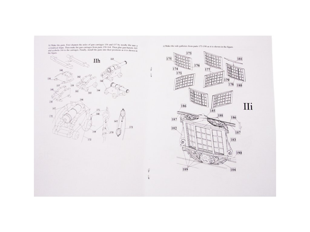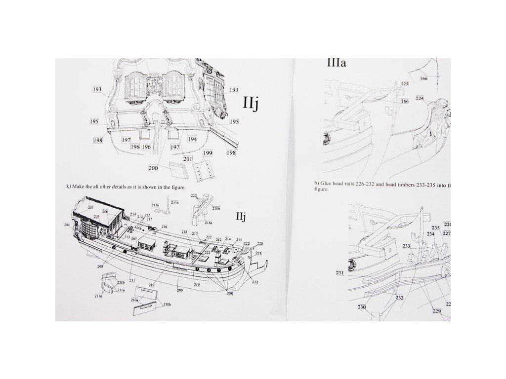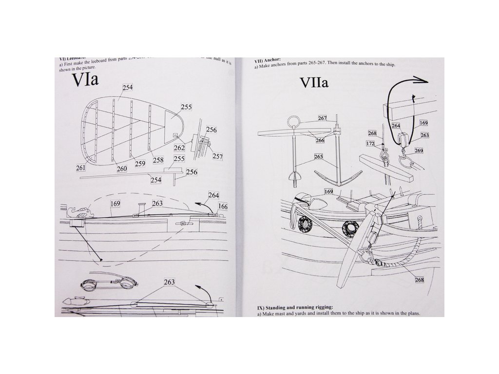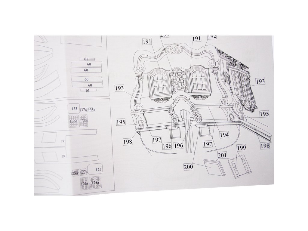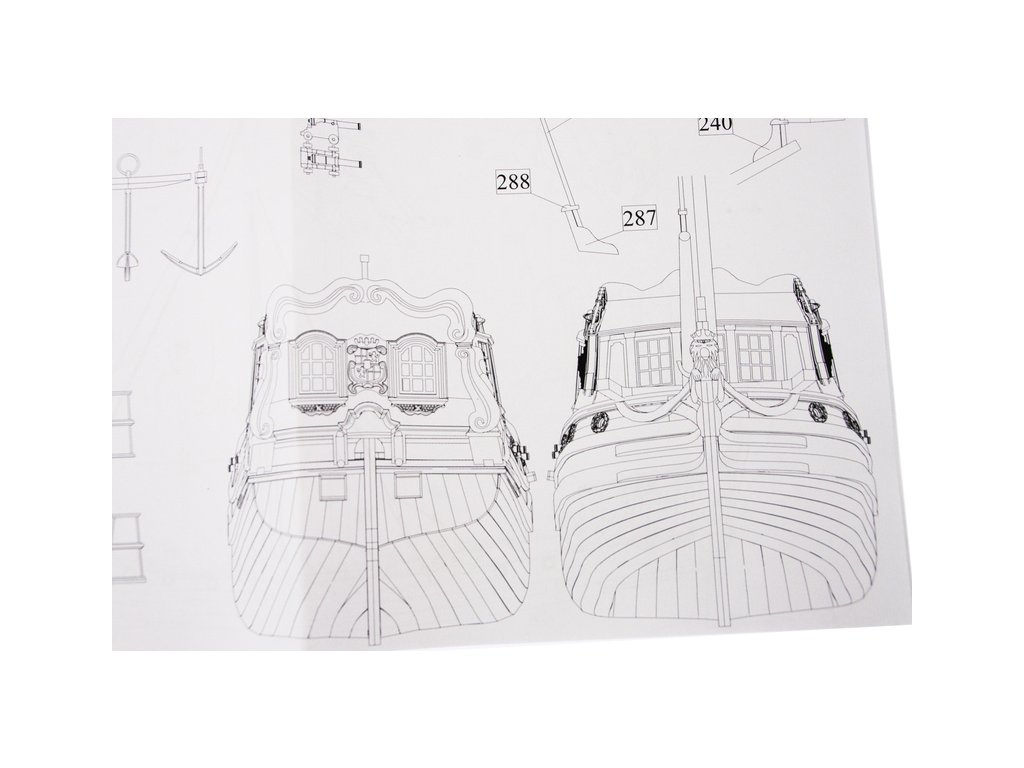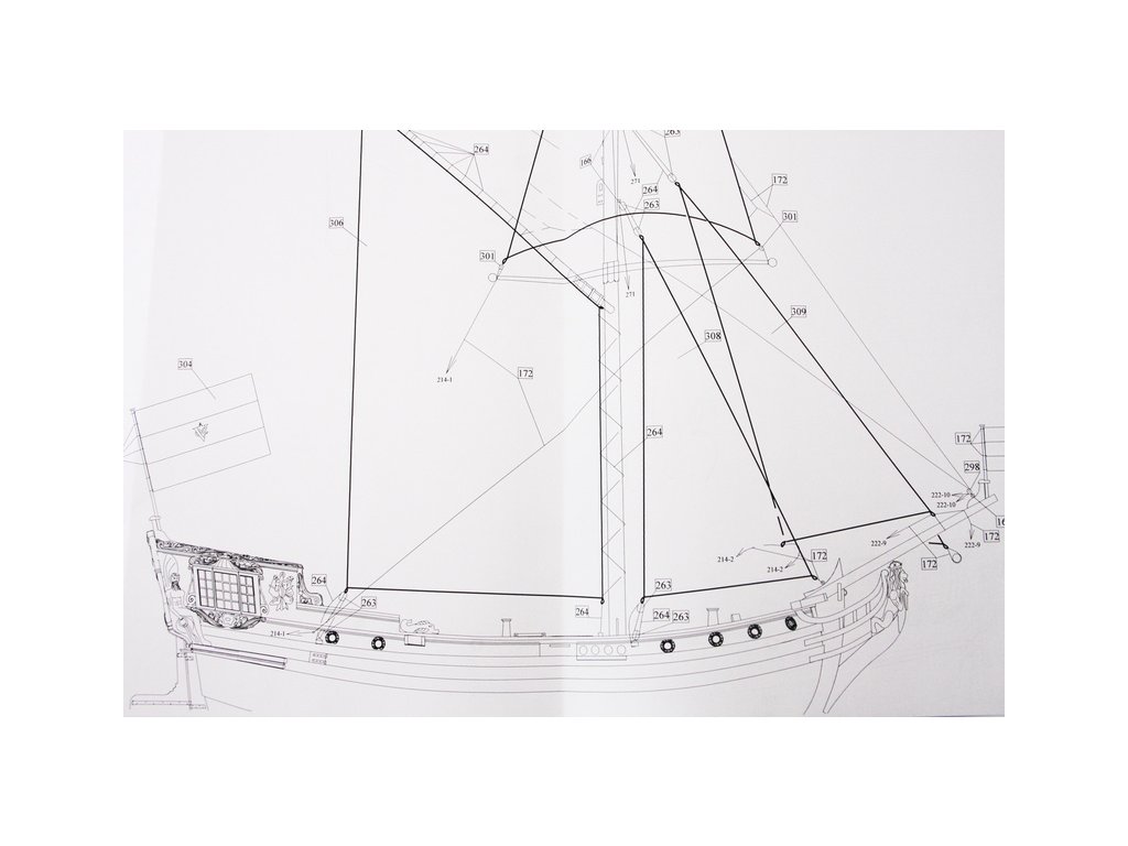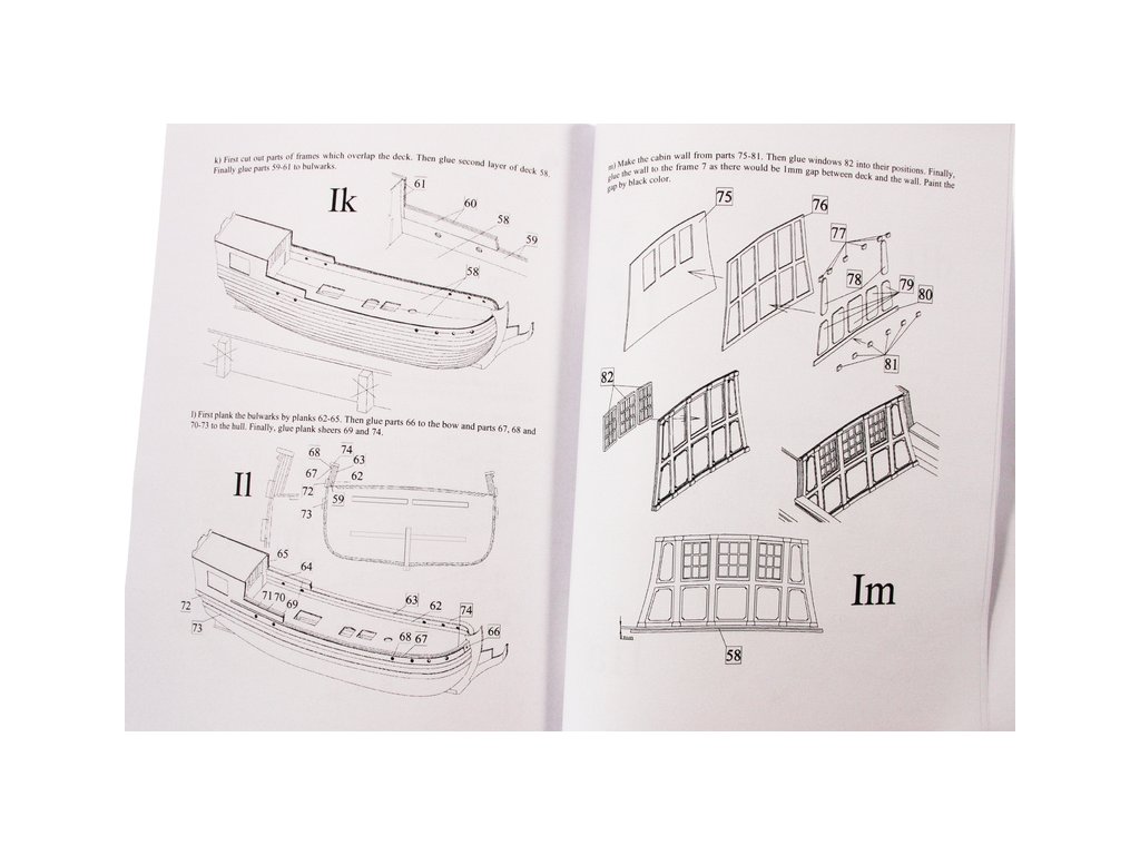 Set obsahuje kompletní sadu výkresové dokumentace modelu v měřítku 1:1 s obrázky jednotlivých detailů. Na výkrese jsou v měřítku nakresleny montážní sestavy, jejich kompletace a to včetně stěžňů a ráhen a způsob vázání lanoví. Vícejazyčný postup stavby rámcově upravuje logické sestavení jednotlivých komponentů.