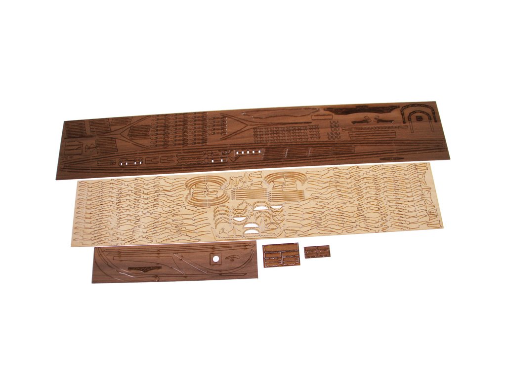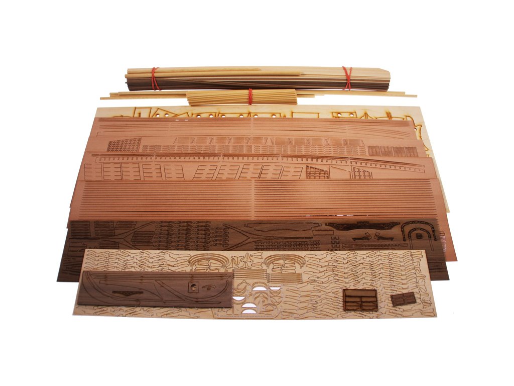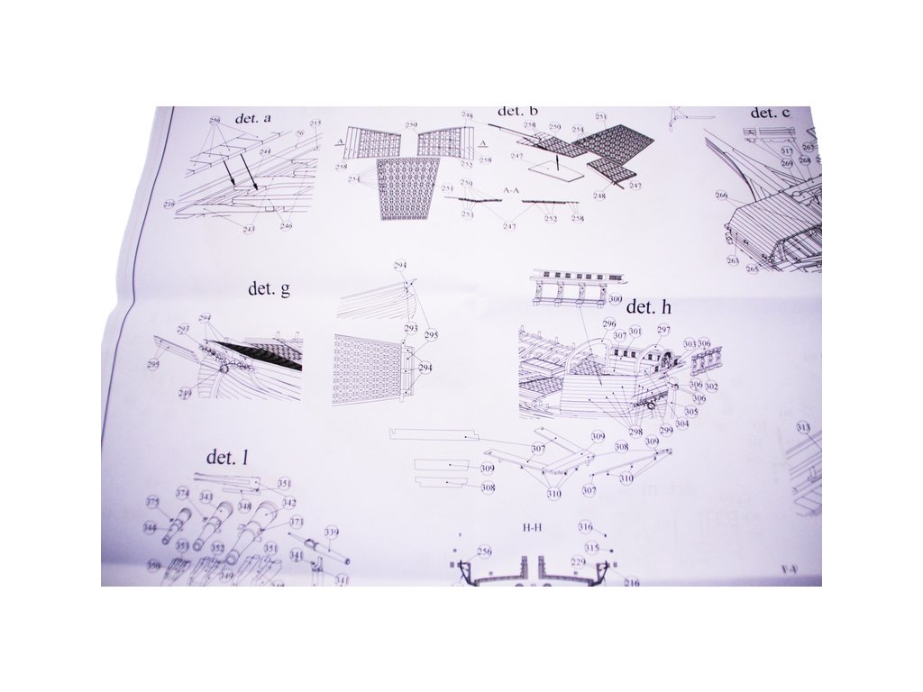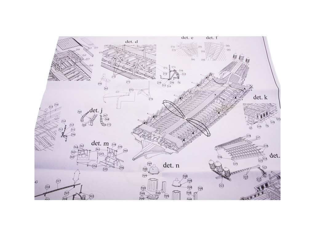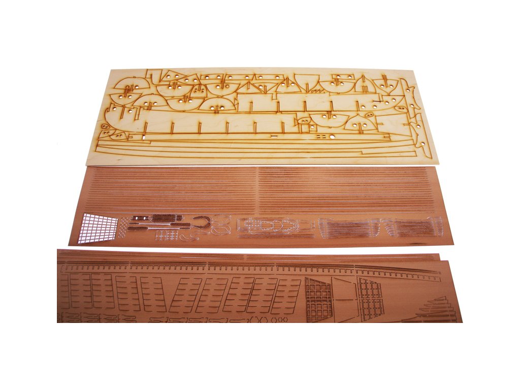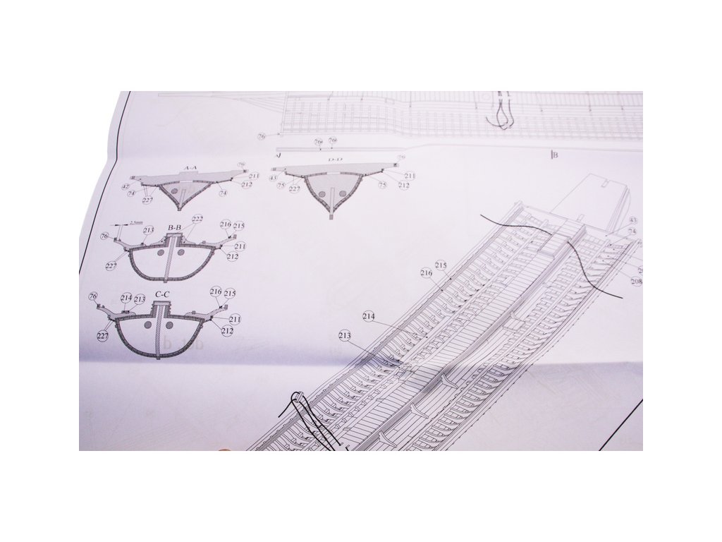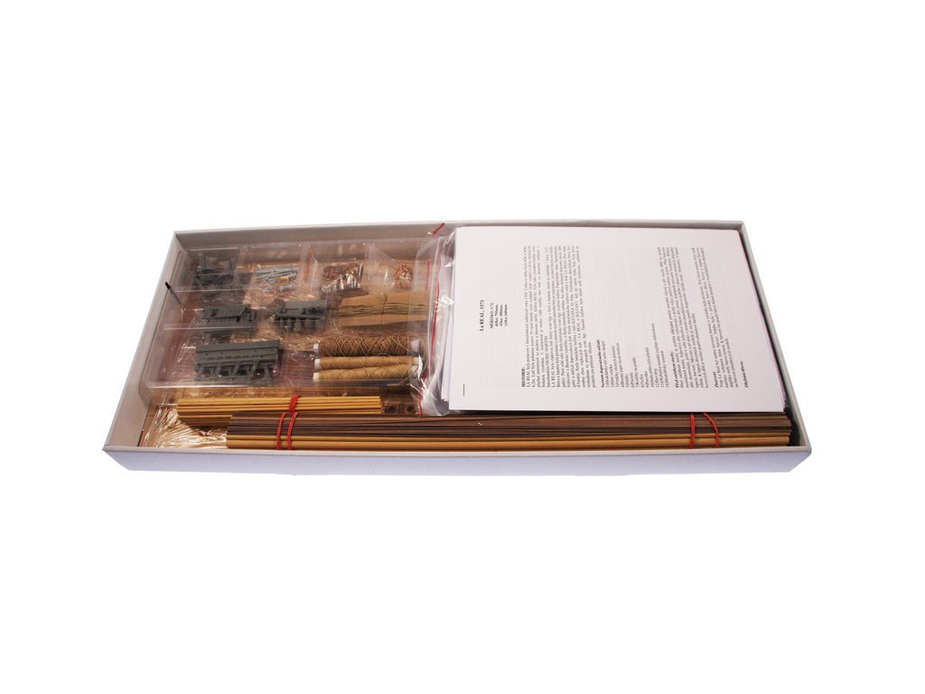 V balení stavebnice makety je sestava laserem vyřezaných desek z překližky a kompletní dřevěné součásti, mosazné součásti, prkna a lišty pro palubu, předtištěné vlajky, látku pro plachtu a dostatek lanoví na celou loď. Sestavení pomáhá podrobný plán stavby a přesné pokyny, manuál EN, FR, SP, CZ.