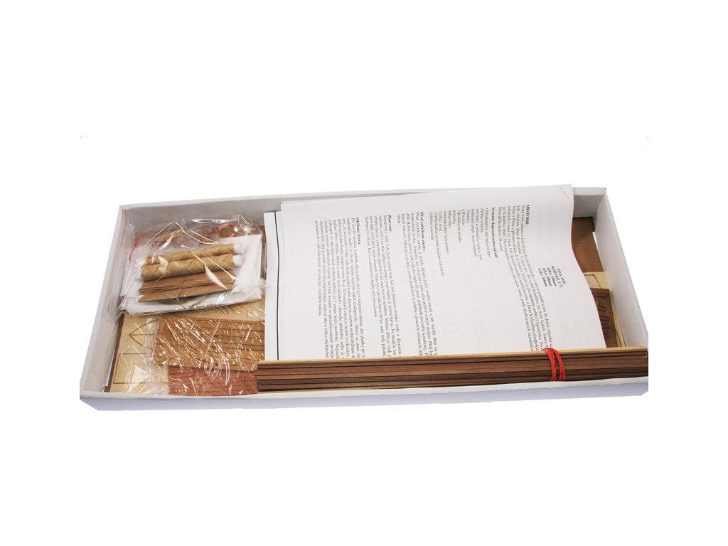 Po otevření víka krabice naleznete dřevěné díly modelu z překližky, sadu lišt, drobné součásti uzavřené v plastovém průhledném blistru, sadu výkresů a manuál.