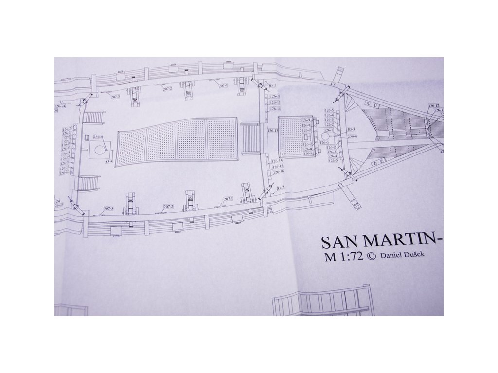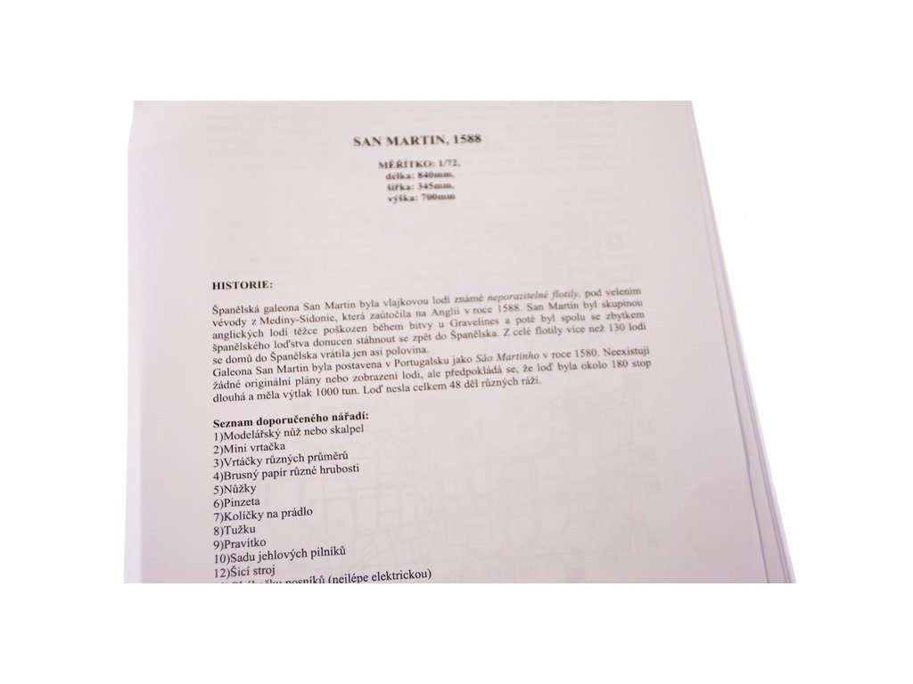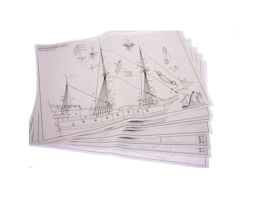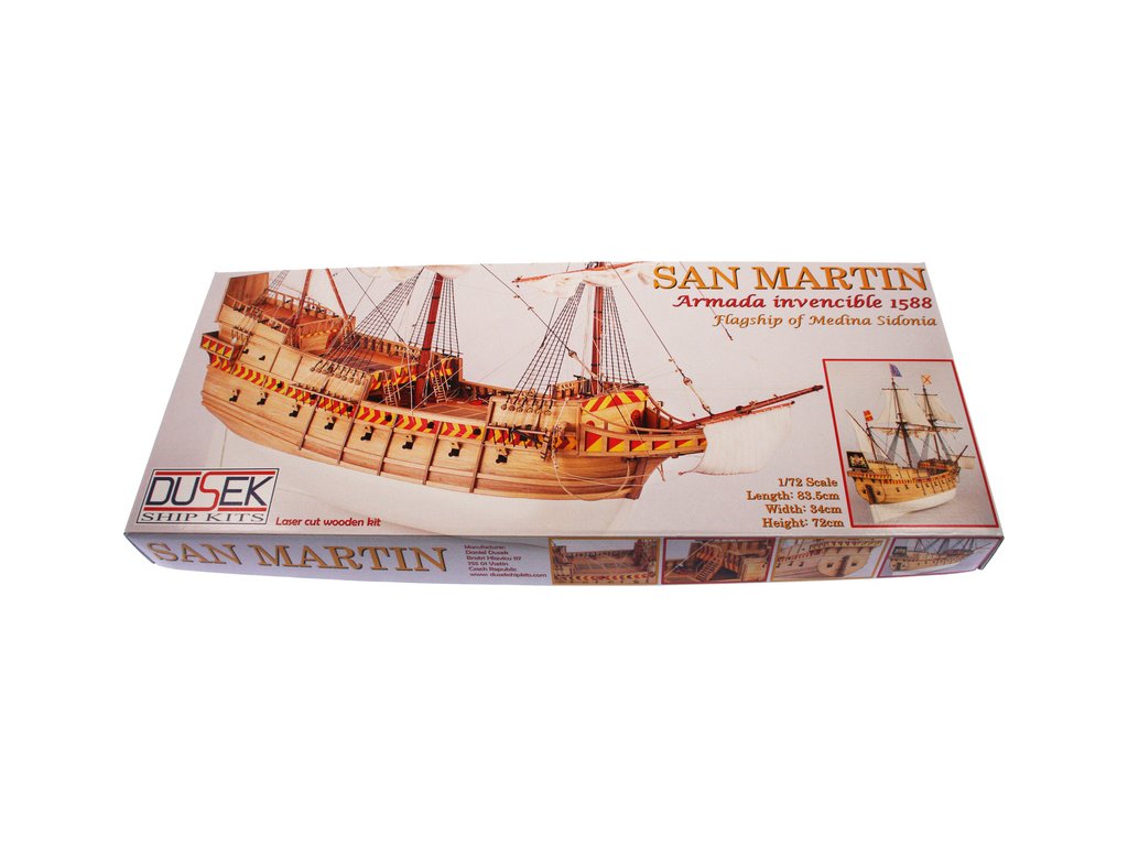 Stavebnice maketylodi San Martin z roku 1588 v měřítku 1:72. Délka modelu lodi je 840mm, stavba převážně ze dřeva s drobnými doplňky, součástí je stavební plán a pokyny s mnoha podrobnými obrázky.