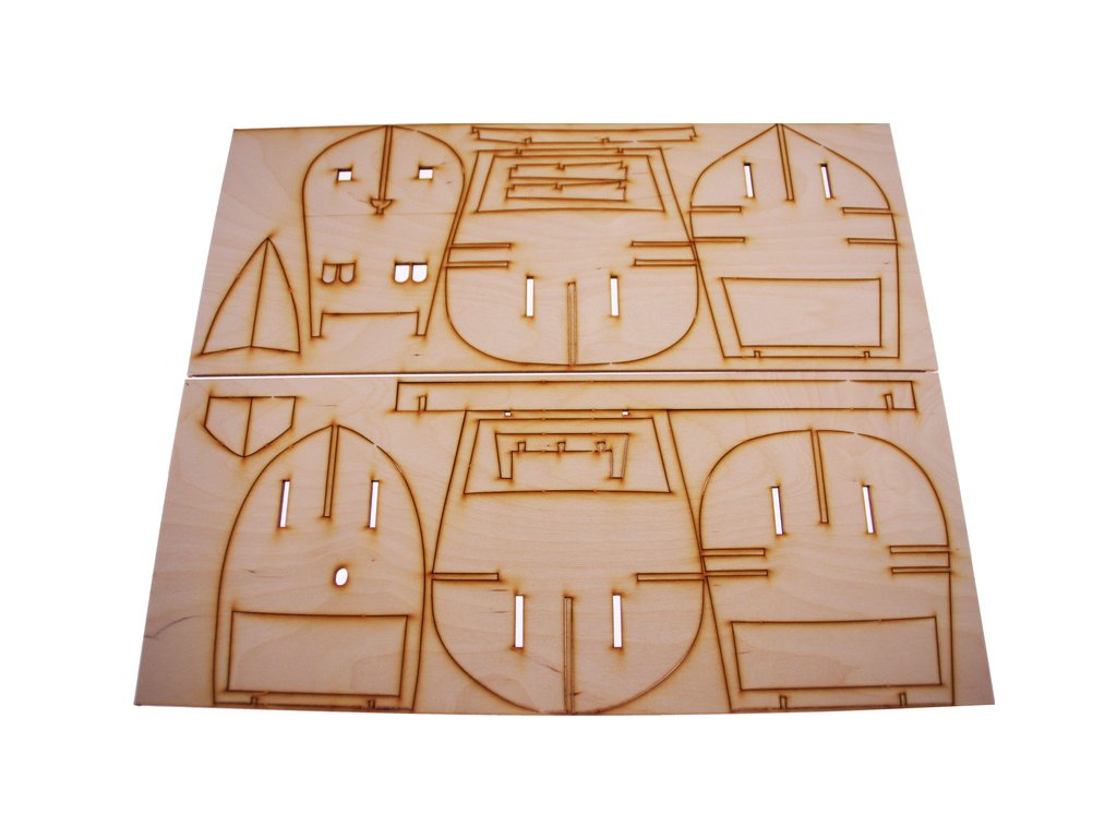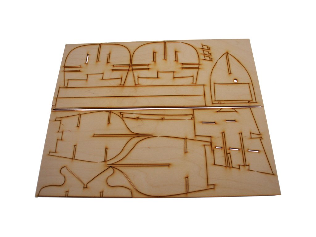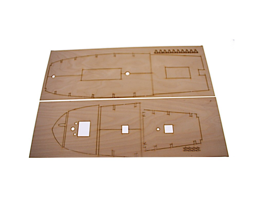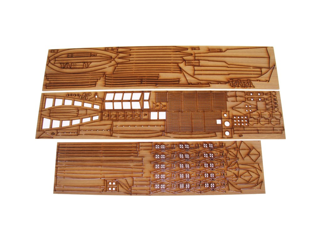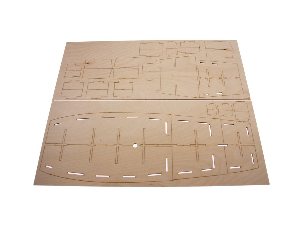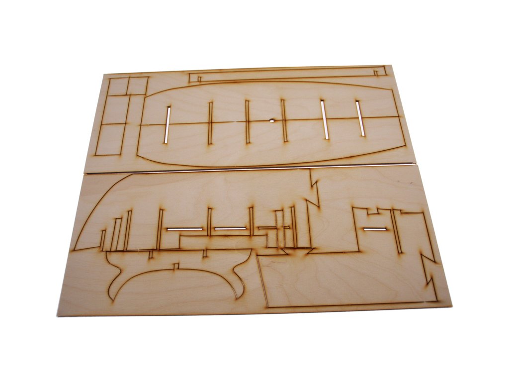 Po otevření víka krabice naleznete dřevěné díly modelu z překližky, sadu lišt, drobné součásti, sadu výkresů a manuál.