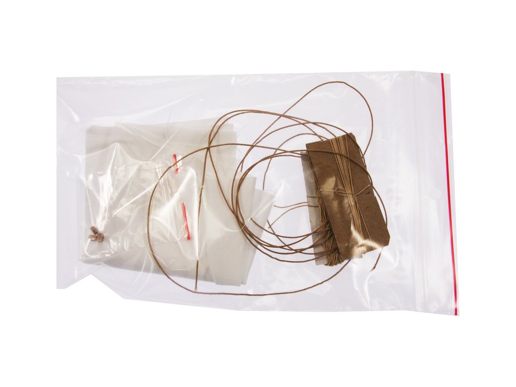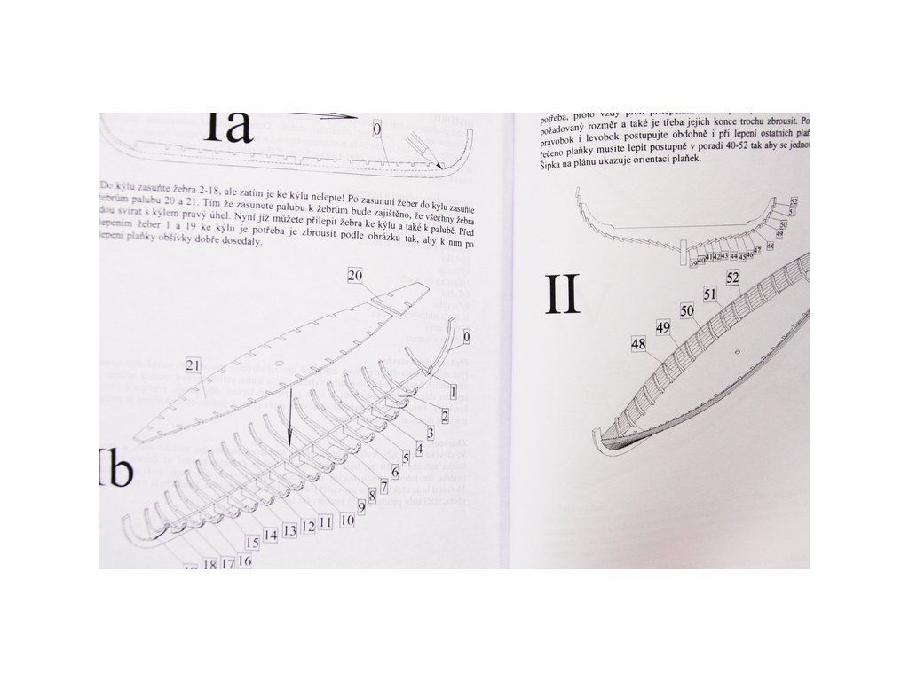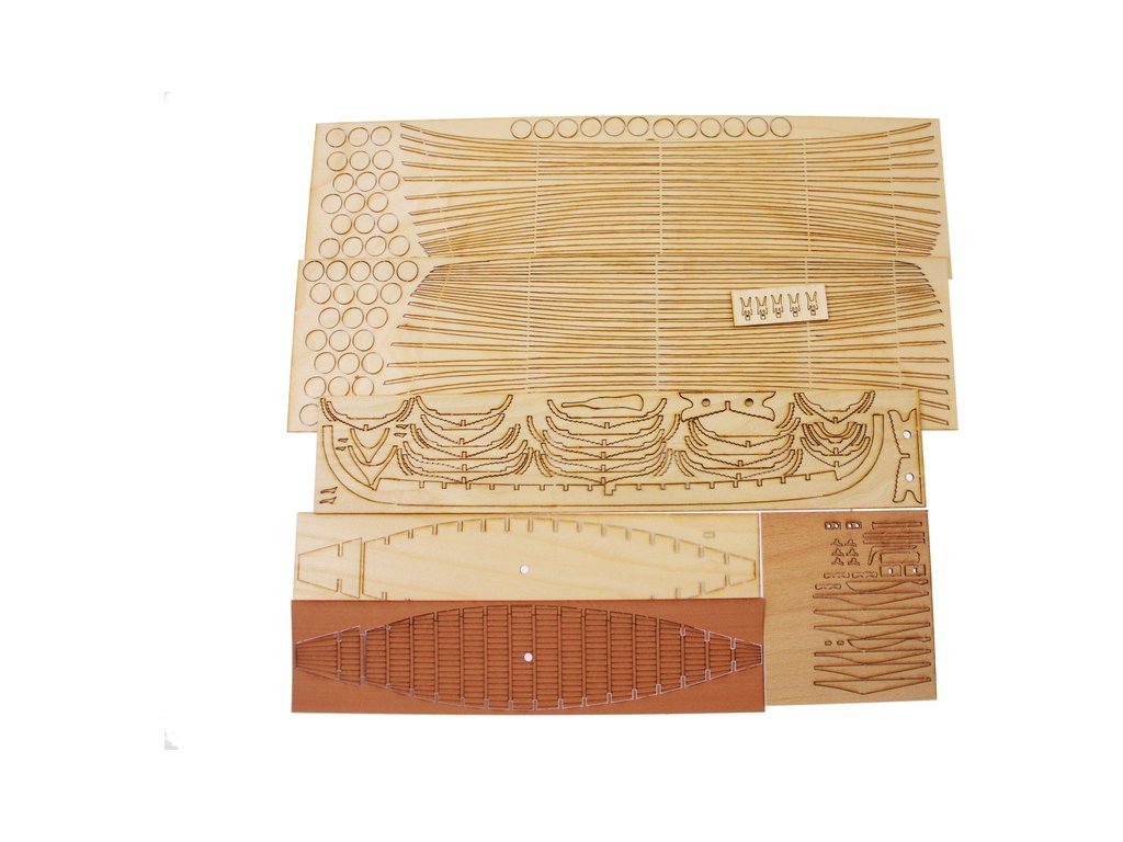 Po otevření víka krabice naleznete dřevěné díly modelu z překližky, sadu lišt, drobné součásti uzavřené v sáčcích, plátno na výrobu plachty, sadu výkresů a manuál.