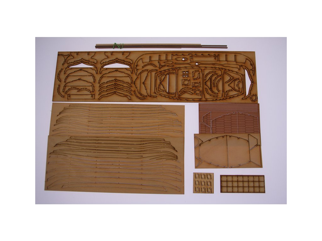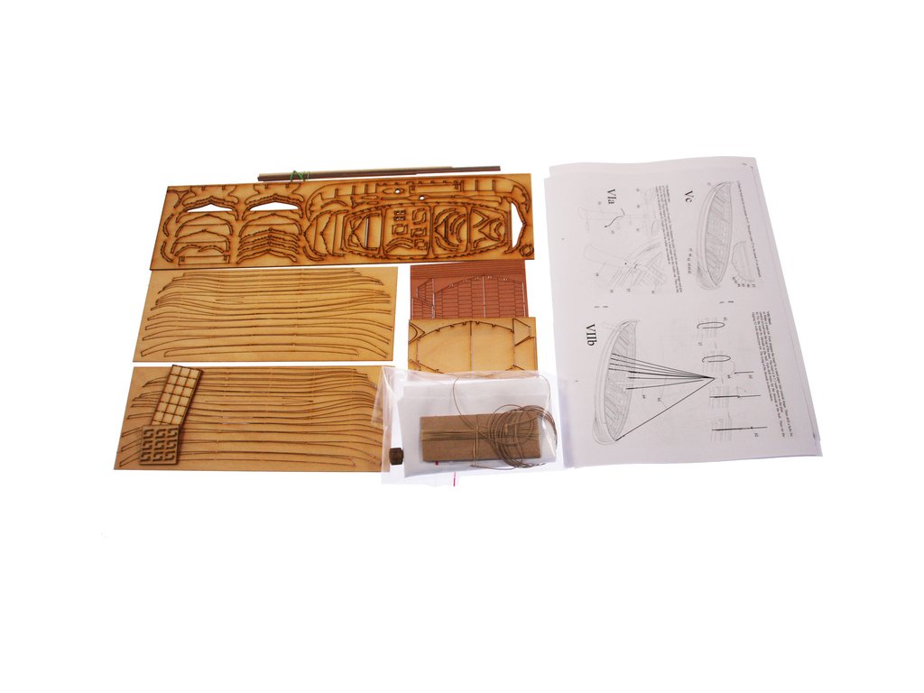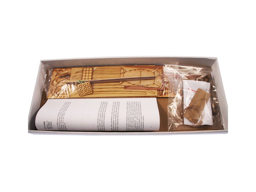 Po otevření víka krabice naleznete dřevěné díly modelu z překližky, sadu lišt, drobné součásti uzavřené v plastovém průhledném blistru, sadu výkresů a manuál.