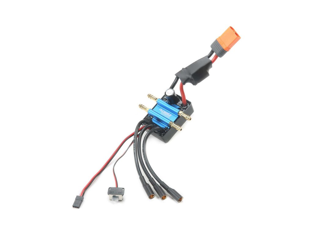 Dynamite programovatelný střídavý regulátor pro RC modely lodí. Trvalý proud až 120 A, napájení 2 až 6 čl. LiPo, napájecí konektor IC5.