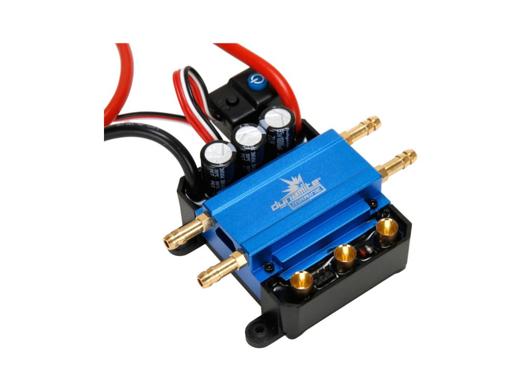 Dynamite střídavý regulátor pro velké modely lodí s trvalým proudem max. 160 A s vodním chlazením pro 3-8 článků LiPo. Parametry regulátoru lze nastavit pomocí programovací karty DYNS3005.