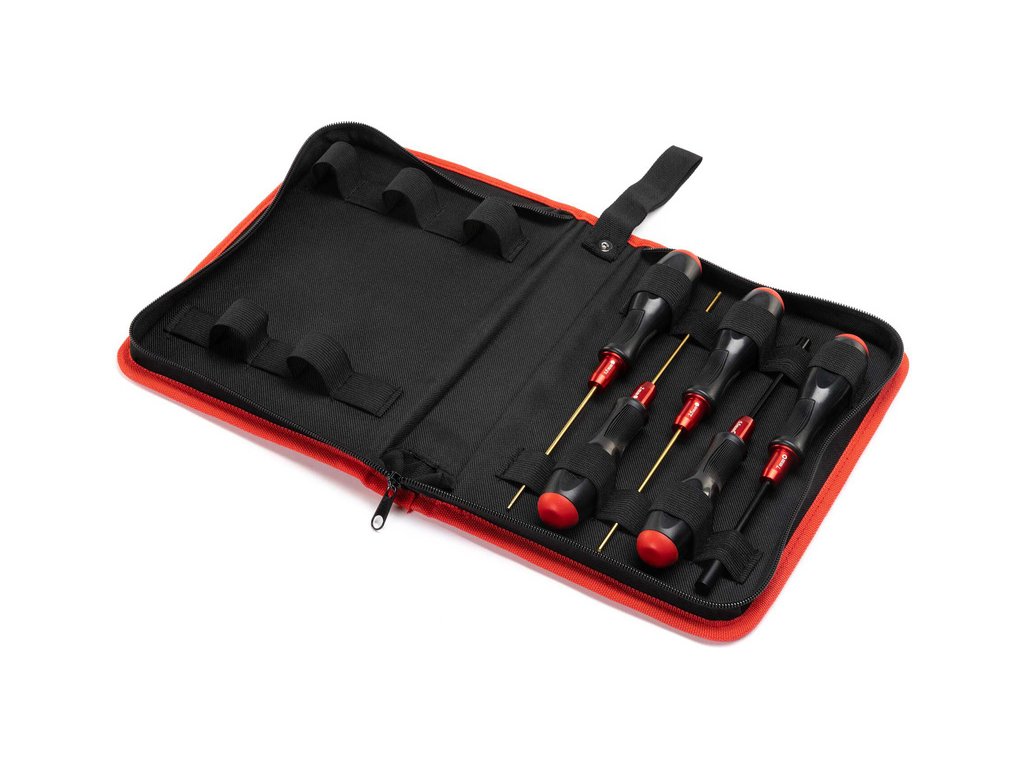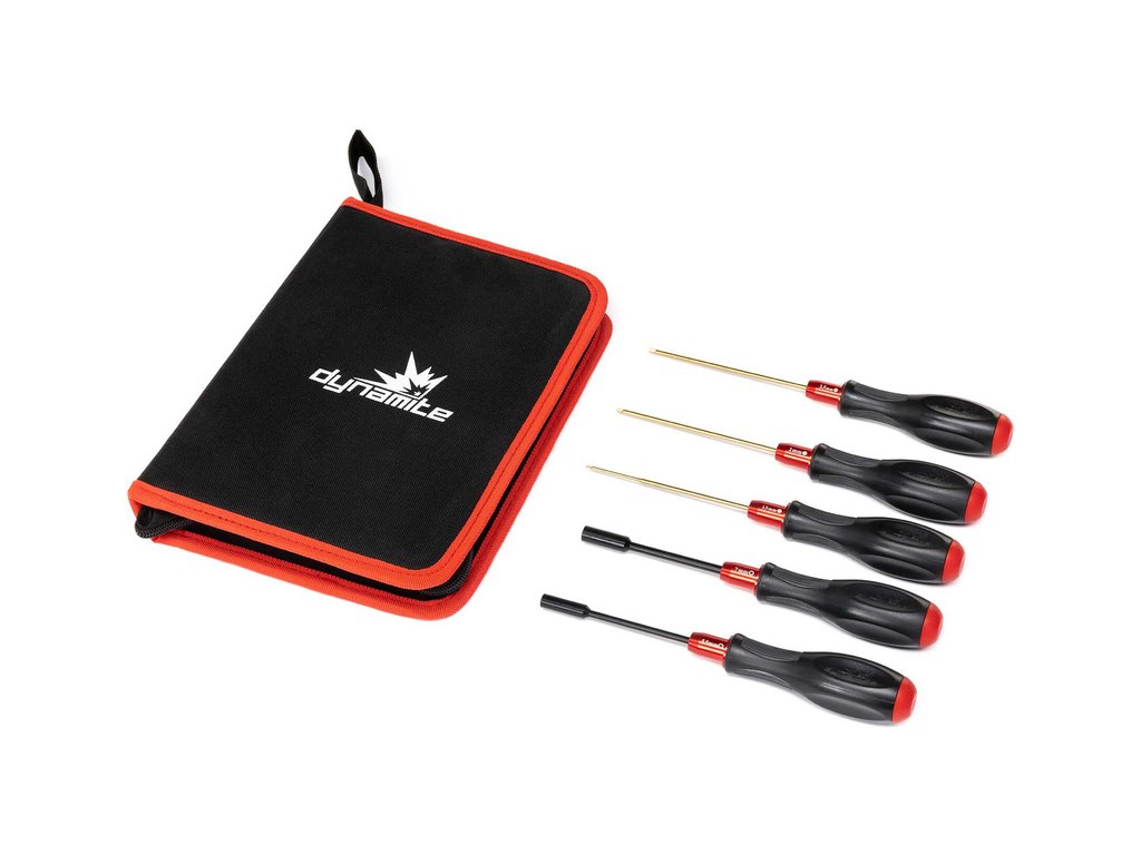 Sada šroubováků Metrická imbus (5 ks) od Dynamite, je základní sadou pro RC auta 1:10. Obsahuje imbus šroubováky 1.5mm, 2mm a 2.5mm, nástrčné klíče 5.5mm a 7mm. Ergonomicky tvarovaná plastová rukojeť s otočnou koncovkou pro pohodlné šroubování. Pouzdro na nářadí s logem.