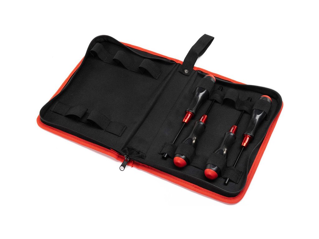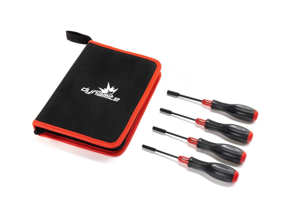 Sada šroubováků, nástrčné metrické (4 ks), obsahuje nástrčné klíče s rozměry: 4mm, 5mm, 5.5mm a 7mm. Sada od Dynamite je ergonomicky navržena, má tvarovanou plastovou rukojeť s otočnou koncovkou pro pohodlné šroubování. Pouzdro na nářadí s logem.
