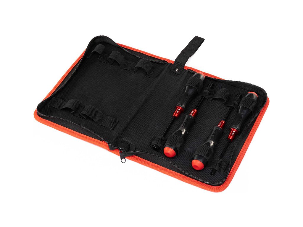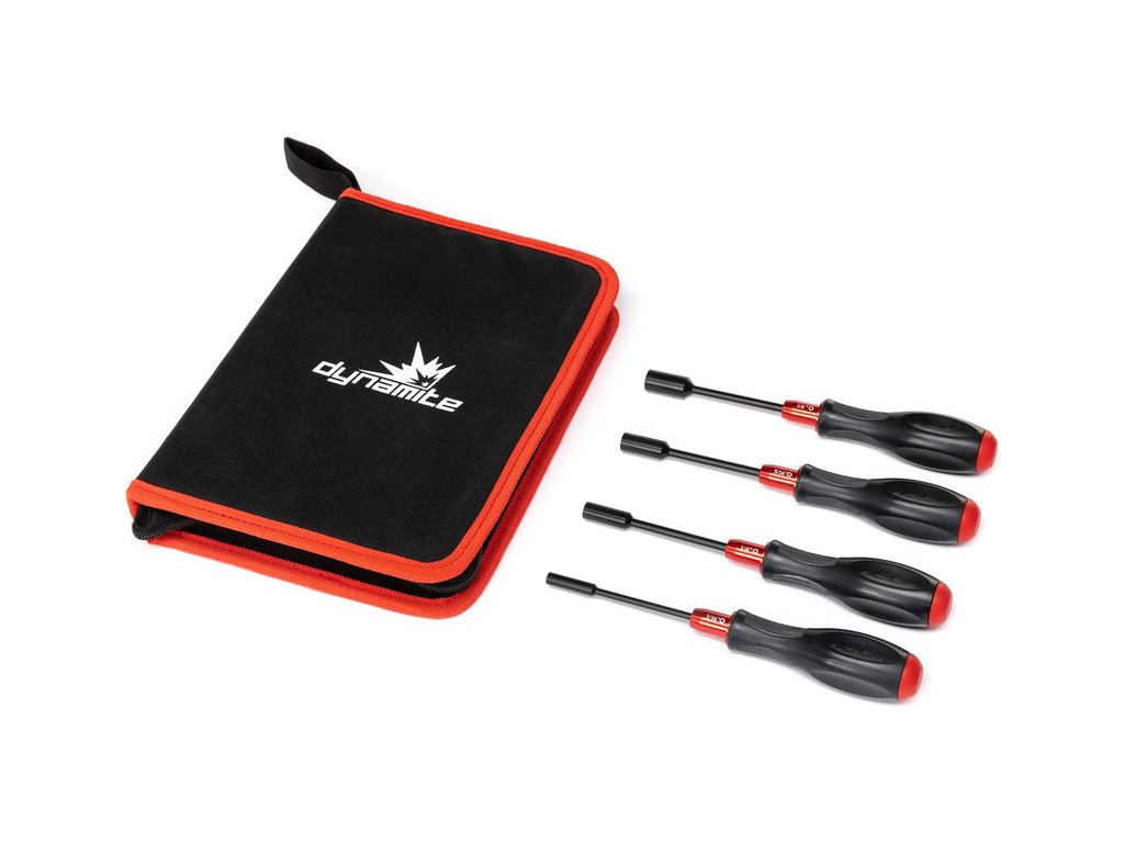 Sada šroubováků US (4 ks) obsahuje nástrčné klíče s rozměry: 3/16"; 1/4"; 5/16" a 3/8". Sada od Dynamite je ergonomicky navržena, má tvarovanou plastovou rukojeť s otočnou koncovkou pro pohodlné šroubování. Pouzdro na nářadí s logem.