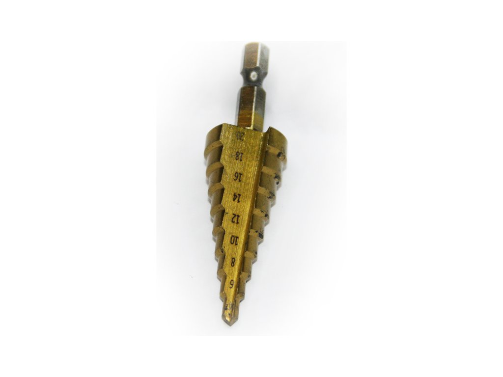 Dynamite výstružník stupňovitý 4-20mm, držák bit 6mm, délka nástroje 46mm, kalibrovací průměry 4, 6, 8, 10, 12, 14, 16, 18, 20mm, délka stupně cca 5mm. Materiál ocel.