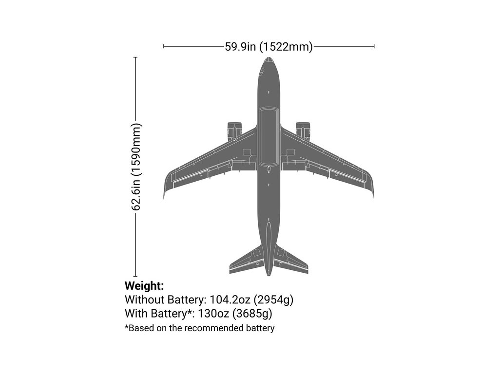 Letadla s úrovní dovednosti 2, jako je tento model, jsou vhodná pro RC piloty, kteří již mají nějaké zkušenosti a dovednosti sestavit, nastavit a nebo létat s modely podobné třídy. Přestože se jedná o zatím nejsnadněji ovládatelný model dopravního letadla, není vhodný jako první RC model pro začínající piloty ani jako první dmychadlový model EDF (Electric Ducted Fan) pro středně pokročilé piloty. Měli byste mít zkušenosti s jednoduššími modely EDF, jako je například E-flite Habu SS (Super Sport) 50 mm nebo 70 mm, či s výkonnějšími modely EDF, jako je E-flite UMX Me 262, Viper 70mm apod.