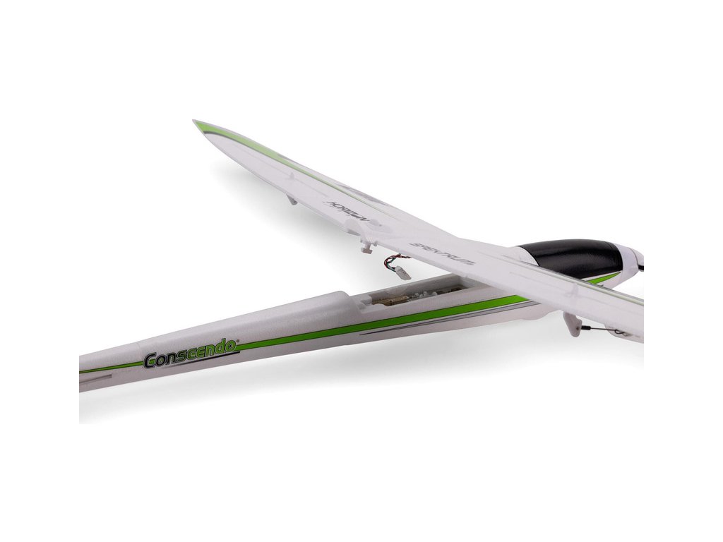 Set UMX Conscendo obsahuje kompletní vybavené díly, připravené k sestavení hned po vybalení z krabice. Jednoduše namontujte jednodílné křídlo bajonetovým šroubem, nainstalujte vlastní nabitou baterii, připojte jej k vašemu 5+ kanálovému vysílači Spektrum vybavenému DSMX/DSM2 a jste připraveni k provozu.
