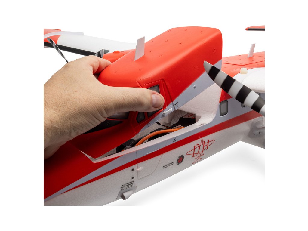 K finální montáži nejsou potřeba žádná lepidla ani speciální nástroje, takže můžete mít model Twin Otter 1.4 m připravený k letu dříve než jiná letadla! Ačkoliv má model praktickou velikost, která umožňuje přepravu v sestaveném stavu v téměř jakémkoli autě, dvoudílné křídlo lze navíc snadno demontovat díky rychlokonektorům handsfree.