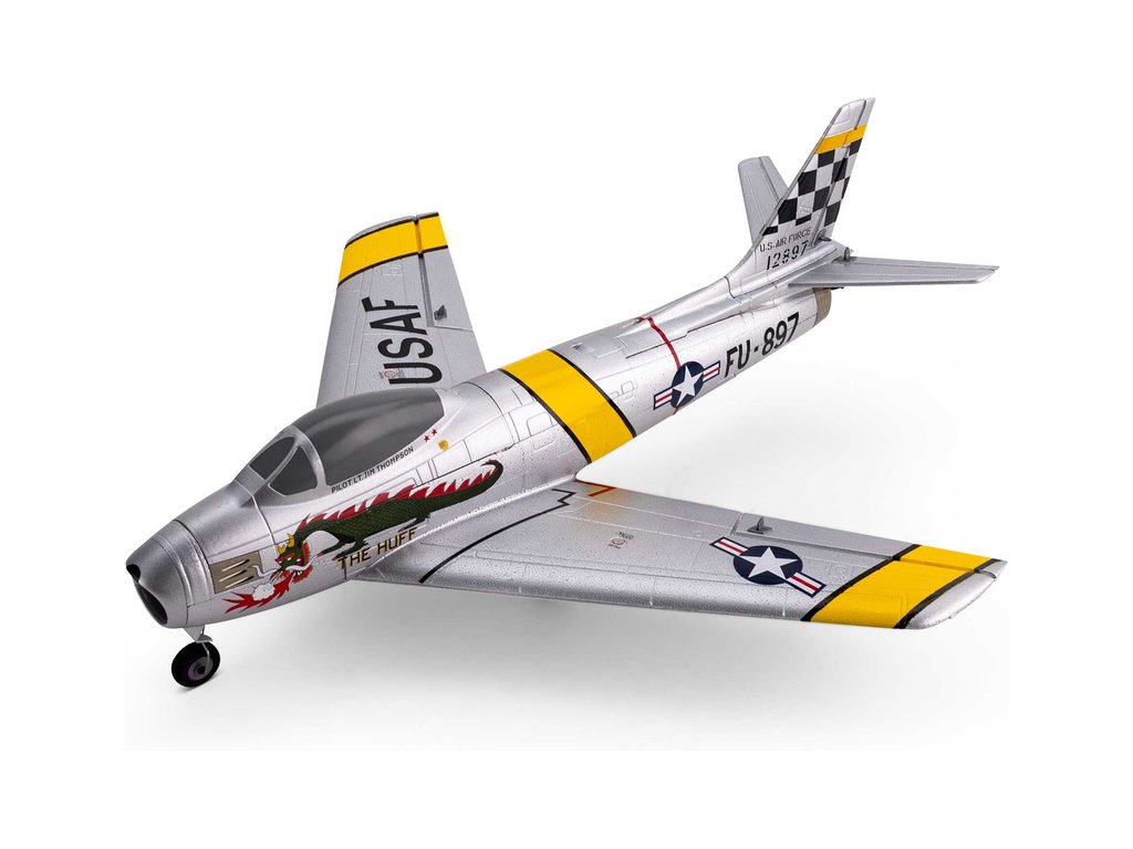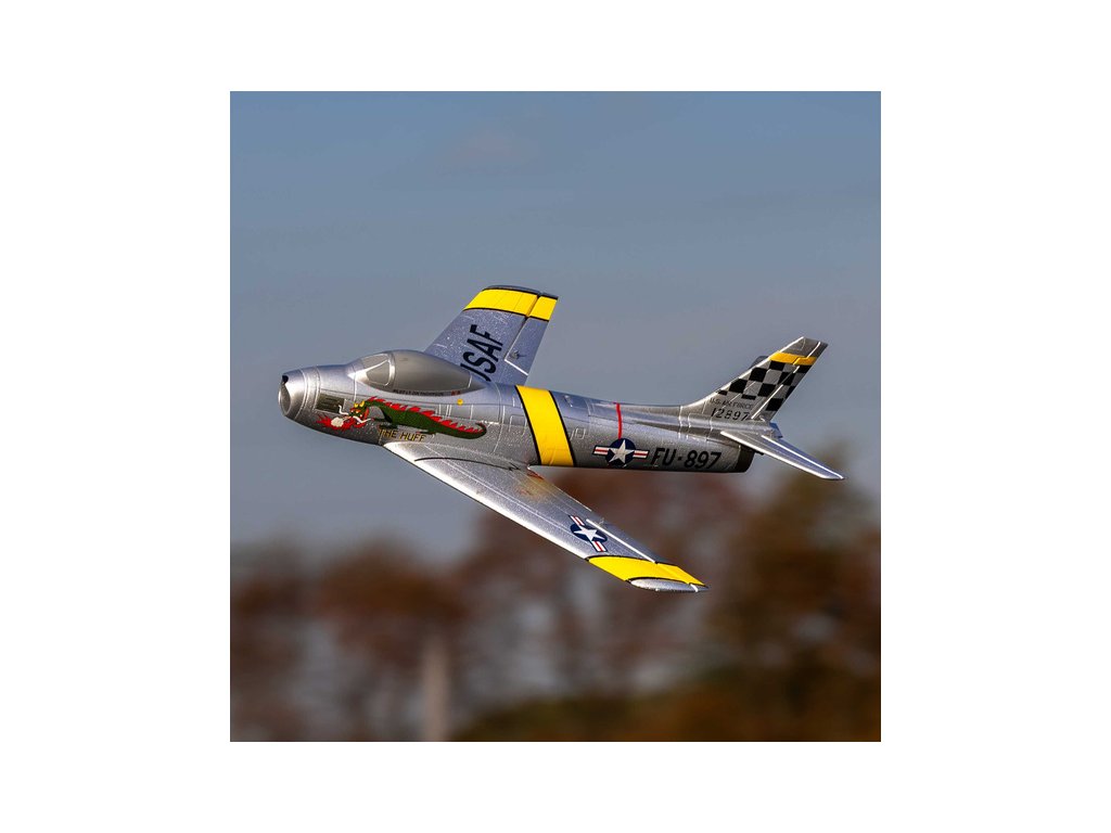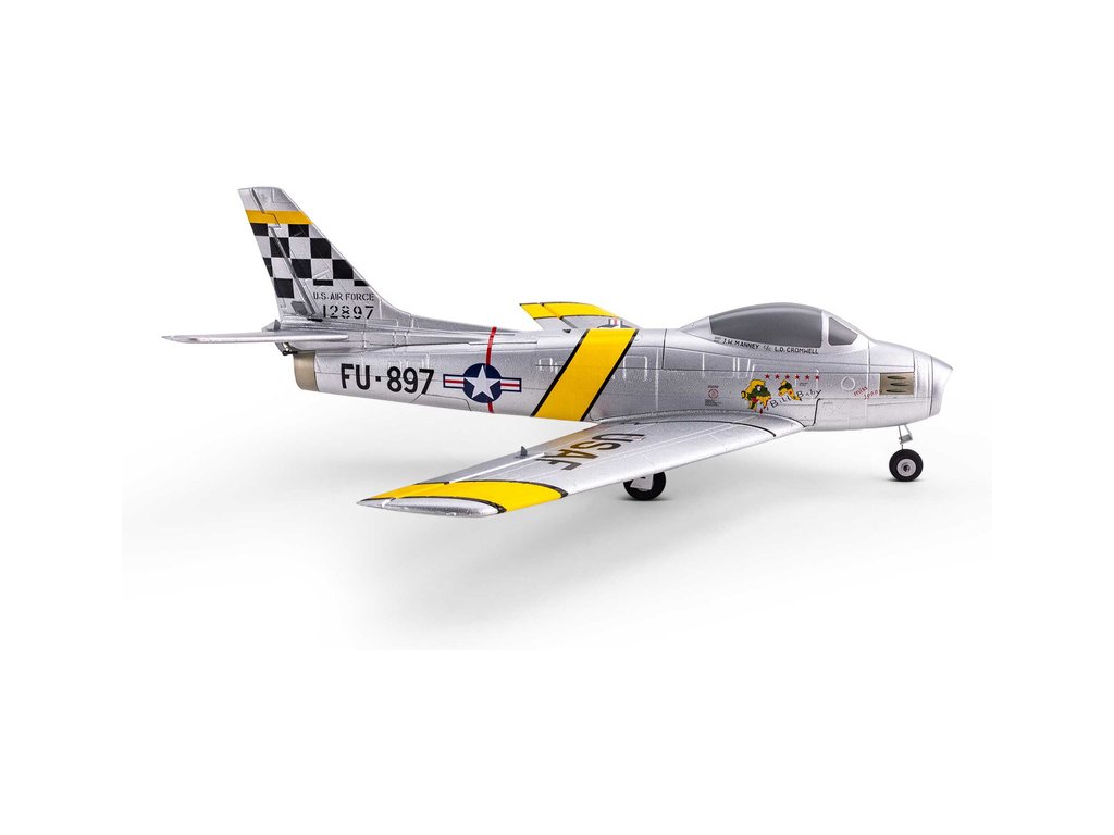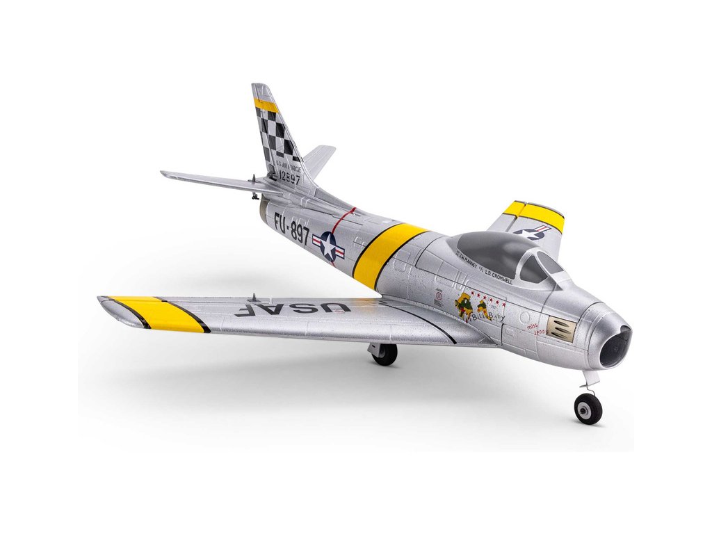 Legendární americký stíhací proudový vojenský letoun F-86 Sabre ve zpracování od E-flite jako Ultra mikro RC model na dálkové ovládání. Sabre pohání mikro 6-lopatkové dmychadlo 30mm se střídavým motorem 1010-8300kv, model má nainstalován přijímač Spektrum se špičkovou technologií 2,4 GHz DSMX® a Safe Select a lineární digitální serva. Doporučena je LiPol baterie 4S 14.8V 450mAh. Sabre má drak z EPS vyztužený uhlíkovými prvky a výkonným pohonem. Model je vybaven exkluzivní technologií Spektrum™ AS3X® a volitelnou technologií ochrany letové obálky SAFE® Select. Navíc poskytuje telemetrii napětí baterie v reálném čase kompatibilním vysílačům, což více než kdy jindy usnadňuje létání a zvyšuje bezpečnost provozu. Pevný podvozek s řiditelným příďovým kolem usnadňuje pojíždění, vzlétání a přistávání na hladkém povrchu. Nebo můžete odejmout podvozek pro vyšší rychlost a vertikální výkon a model házet z ruky, díky automatickému režimu Hand Launch Assist a přistávat na trávě.