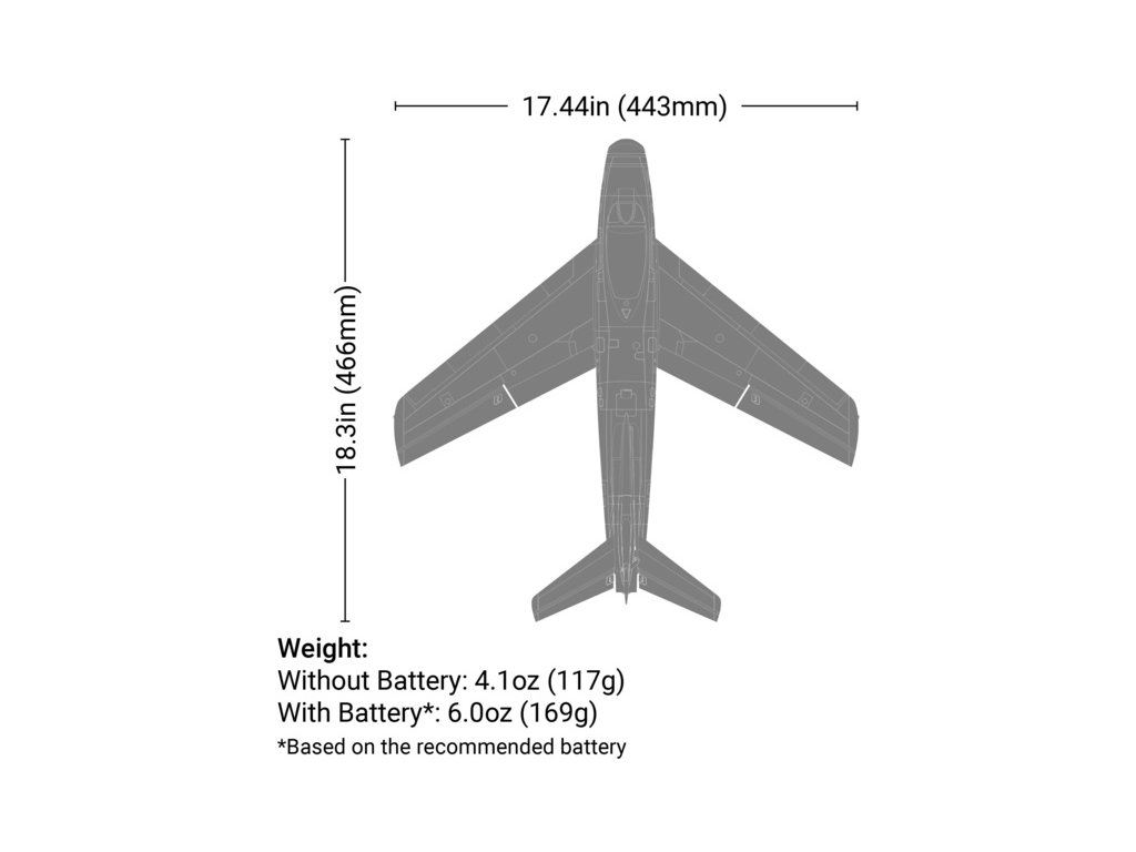 UMX F-86 Sabre je 100% sestaven a připraven k letu hned po vybalení z krabice! Je vybaven špičkovou technologií Spektrum 2,4 GHz, která se spáruje s vaším 5+ kanálovým vysílačem Spektrum DSMX/DSM2, takže můžete létat během několika minut po otevření krabice.