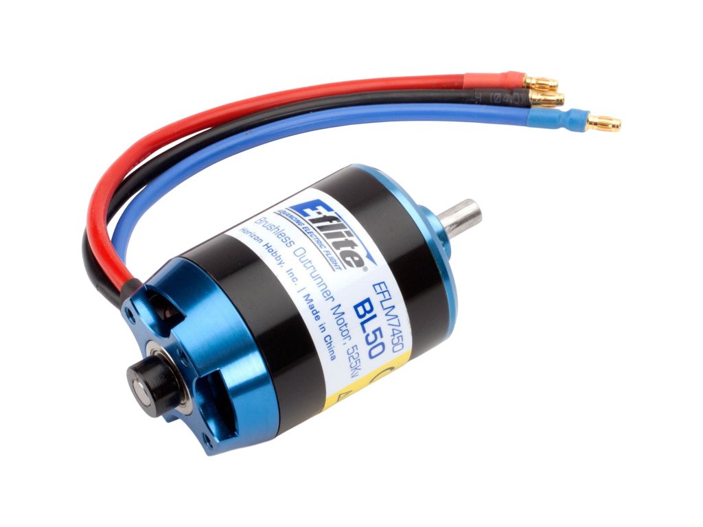 Střídavý motor BL50 Outrunner 525ot/V pro RC modely letadel o rozpětí do cca 2m a hmotnosti 3kg, jako např. E-flite Cessna 150T, Carbon Cub 2m apod.. Napájení do 6S LiPol, hmotnost 330g, rozměry ø42.3 mm x 58.5 mm, hřídel 6mm.