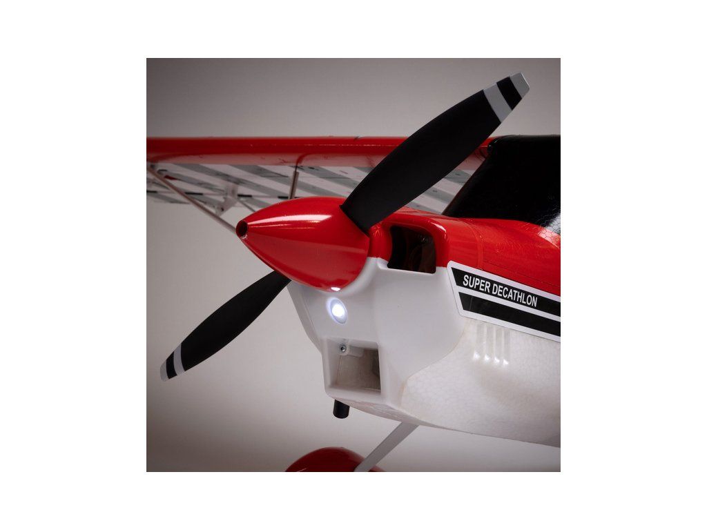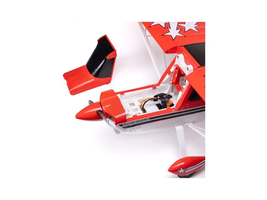 Cvičný akrobatický RC model letadla E-flite Super Decathlon 1.2m. Je ideální pro piloty s menšími zkušenostmi se sportovním létáním a akrobacií, kteří se chtějí zdokonalit v pilotáži a přejít poté na plnokrevný akrobatický model. K napájení je možné použít 3-4S LiPo 2200–3200 mAh akumulátor. Vysoký výkon dodává instalovaný střídavý motor a regulátor Spektrum Smart 45A s podporou telemetrie. Použita jsou silnější digitální serva s kovovými převody a táhla s kulovými čepy pro přesné řízení. Nechybí ani maketová LED přistávací a navigační světla spolu s řadou detailů v měřítku, které poskytují autentický zážitek z létání. Model má ideální střední velikost a pro snadnou přepravu a skladování je obsaženo jednodílné křídlo, které se zajišťuje dvěma šrouby s velkou válcovou hlavou pro dotažení rukou. Rychlou montáž zajišťují konektory handsfree, které se samy připojí při nasazení křídla.