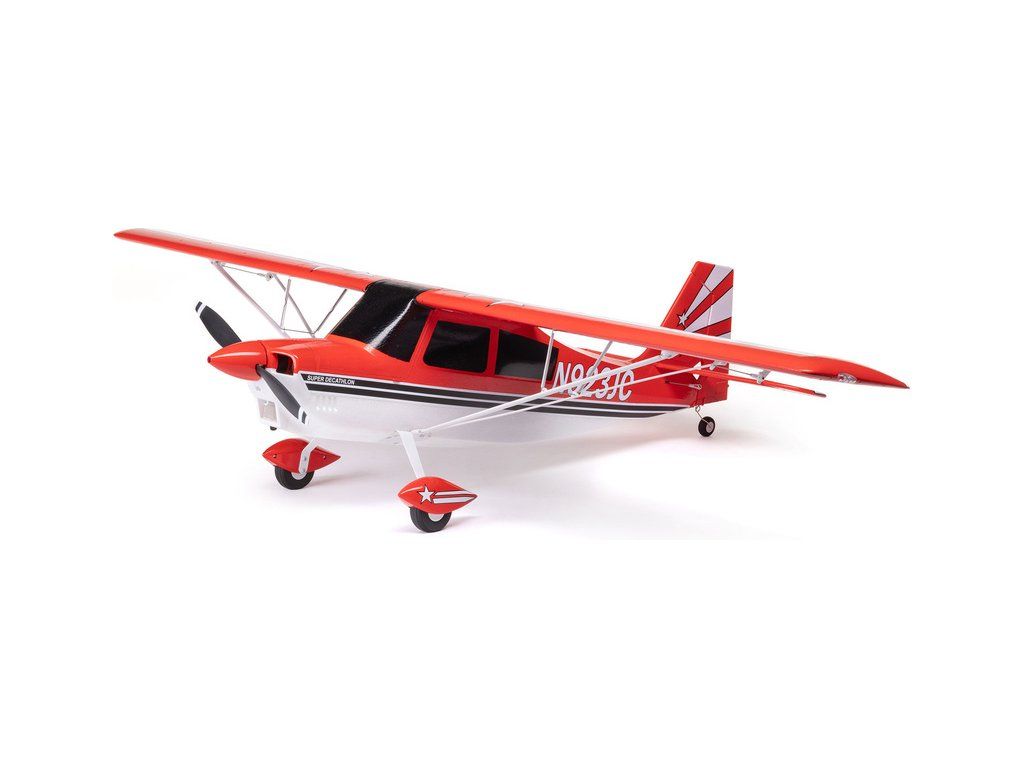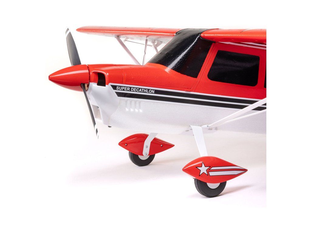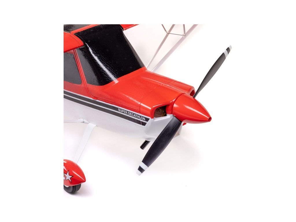 Cvičný akrobatický RC model letadla E-flite Super Decathlon 1.2m. Je ideální pro piloty s menšími zkušenostmi se sportovním létáním a akrobacií, kteří se chtějí zdokonalit v pilotáži a přejít poté na plnokrevný akrobatický model. K napájení je možné použít 3-4S LiPo 2200–3200 mAh akumulátor. Vysoký výkon dodává instalovaný střídavý motor a regulátor Spektrum Smart 45A s podporou telemetrie. Použita jsou silnější digitální serva s kovovými převody a táhla s kulovými čepy pro přesné řízení. Nechybí ani maketová LED přistávací a navigační světla spolu s řadou detailů v měřítku, které poskytují autentický zážitek z létání. Model má ideální střední velikost a pro snadnou přepravu a skladování je obsaženo jednodílné křídlo, které se zajišťuje dvěma šrouby s velkou válcovou hlavou pro dotažení rukou. Rychlou montáž zajišťují konektory handsfree, které se samy připojí při nasazení křídla.