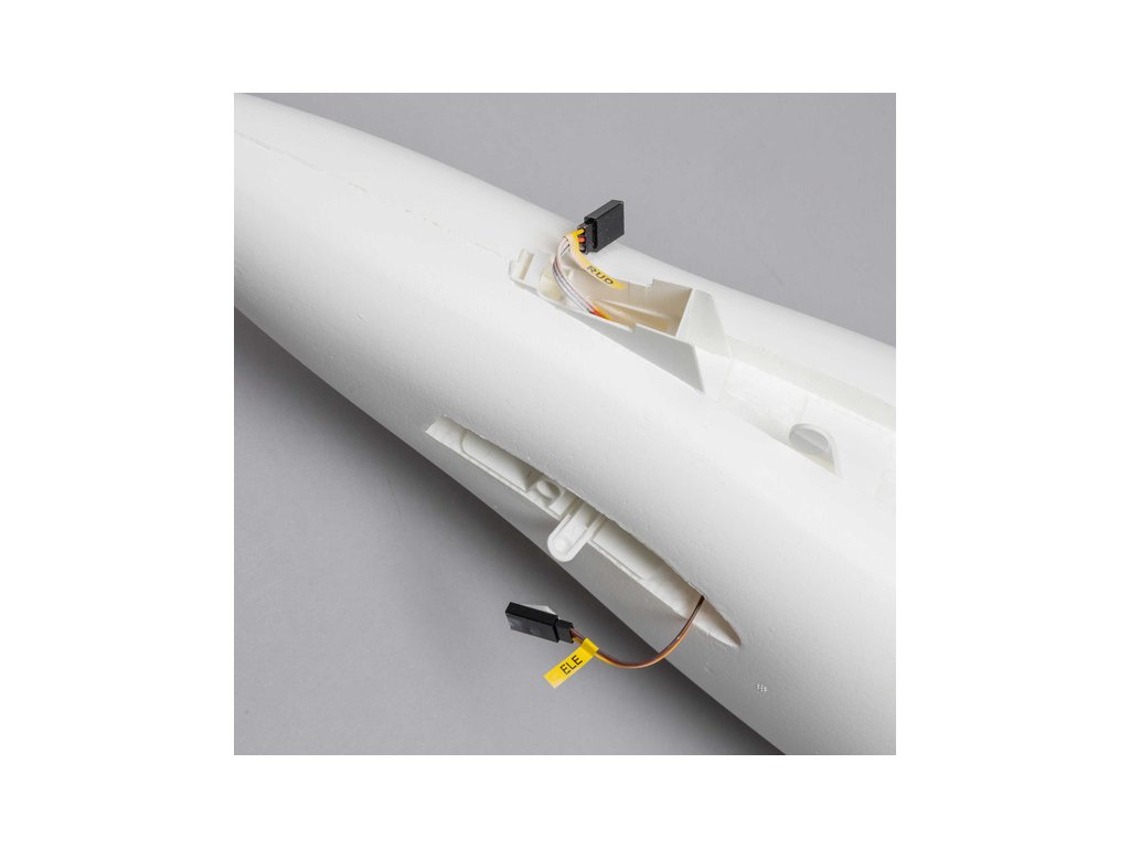 Náhradní díl pro RC model letadla Airbus A320neo 1.5m: trup zadní bílý. S instalaovanou západkou krytu, držáky ocasních ploch, konektorů a kabeláže.