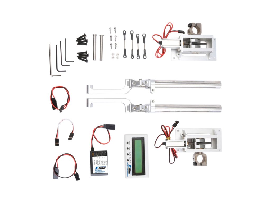 Dvoukolý elektrický zatahovací podvozek pro obří modely s hmotností do 15,9kg s motory 50-60ccm. Primárně určen pro model P-51D Mustang 60ccm ARF. Programovatelná řídící jednotka s externí LED zobrazovací jednotkou, možnost napájení samostatnou baterií 2 čl. LiFe/LiPol. Balení obsahuje i podvozkové nohy a řídící elektroniku s připojovacími kabely.