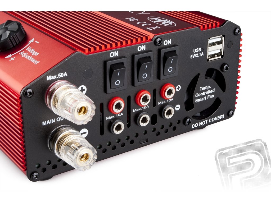 Hlavní výstup zdroje 15-30 V/50 A (max. 1200 W) je opatřen robustními šroubovacími zdířkami pro standardní 4 mm banánky. Navíc jsou k dispozici 3 paralelní zásuvky pro 4 mm banánky opatřené vypínači. Napětí výstupu je nastavitelné pomocí knoflíku na předním panelu, napětí a proud na výstupu jsou zobrazovány na LCD displeji.