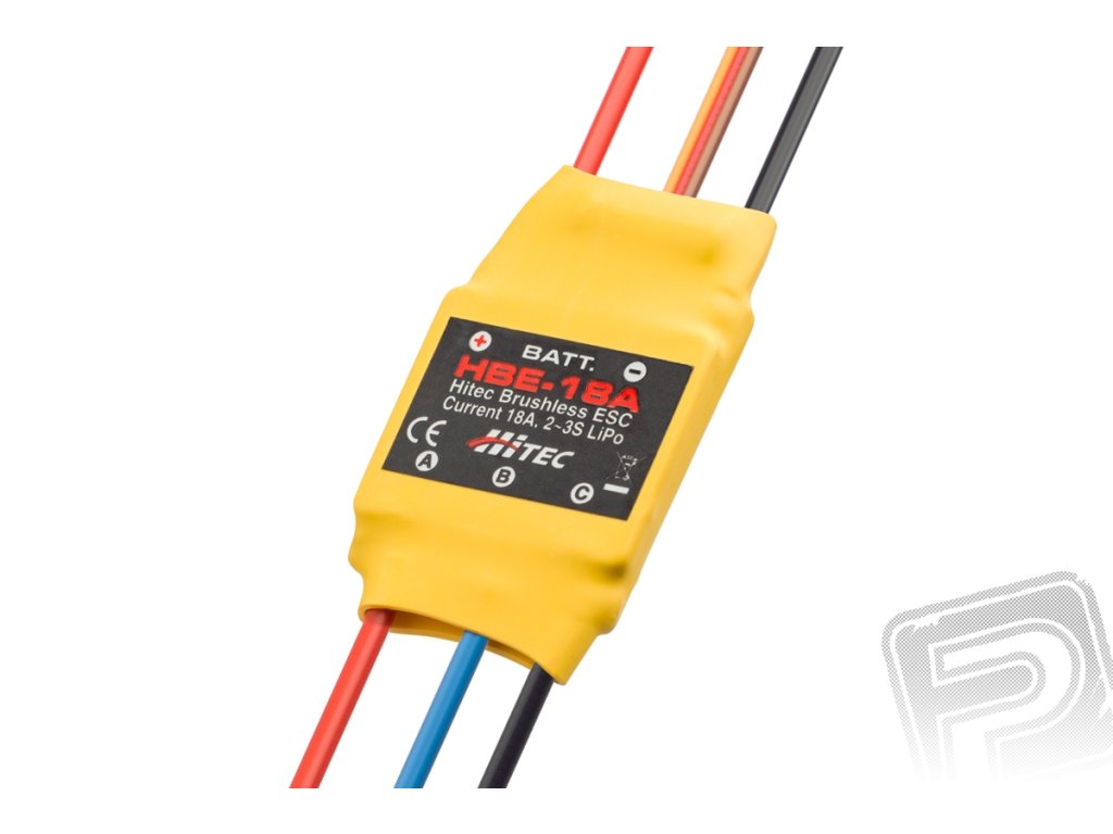 HBE-18A je střídavý elektronický regulátor otáček 18 A pro napájení z 2-3 S LiPo akumulátoru s vestavěným stabilizátorem napájení BEC 5 V/2A. Délka napájecích a motorových kabelů regulátoru je speciálně přizpůsobena pro instalaci v modelech s tlačným motorem na pylonu, jako jsou Hitec SkyScout a Multiplex EasyStar II, ale můžete jej stejně dobře použít i v modelech s motorem umístěným klasicky v přídi.