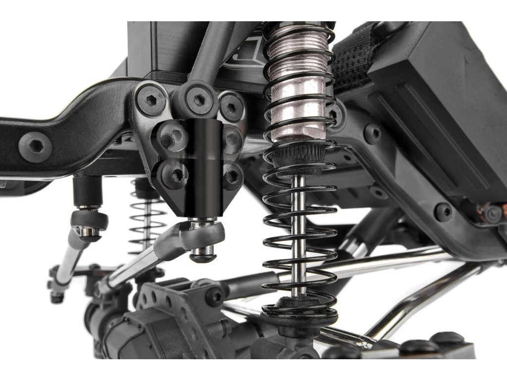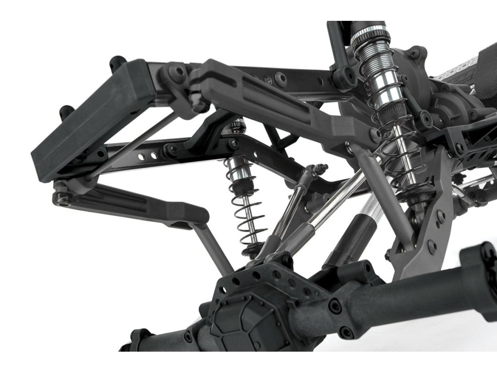 Čím je Enduro Ecto Trail Truck výjimečný? Balíček odpružení Gatekeeper (GKSTM)! Balíček GKSTM se skládá ze zadních vlečných ramen, která posouvají tlumiče dopředu, což umožňuje větší okno pro ladění tlumičů a zajišťuje lepší rozložení hmotnosti. Vlečná ramena jsou spojena se zadní protiprokluzovou tyčí pro stabilnější a konzistentnější odpružení při plazení po skalách. Nastavitelný hliníkový držák pásové tyče pevně přišroubovaný k liště podvozku poskytuje modelu Enduro Ecto spolehlivější a citlivější řízení bez prohýbání. Naše vložky pro uchycení tlumičů s několika montážními pozicemi umožňují přesné vyladění odpružení, ať už se jedná o posunutí tlumičů nahoru, dolů, dopředu nebo dozadu.