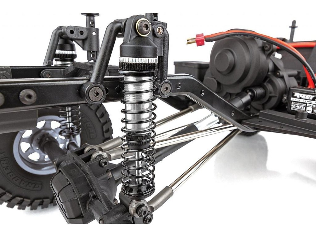 Zavěšení: Odolná vstřikovaná horní a dolní ramena zavěšení s optimalizovanými kulovými čepičkami poskytují maximální kloubovost zavěšení spolu s moderním vzhledem měřítka zavěšení terénních vozidel.