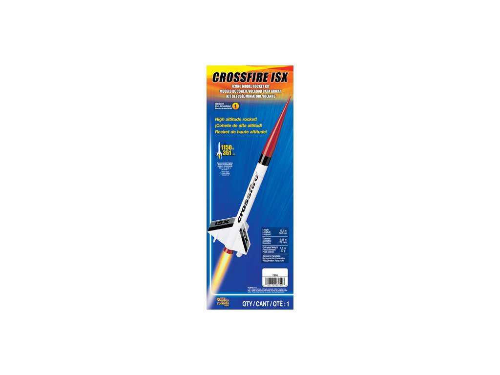 Model rakety Estes Crossfire ISX je na raketové motory řady A - C. Spolehlivá raketa pro mírně pokročilé Crossfire ISX létá do výšky 350 m, návrat 30 cm padákem.