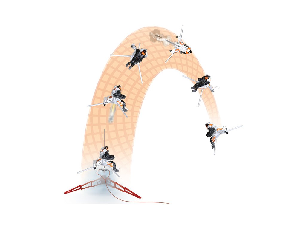 - Vrchol letu a výmet - po dohoření zpožďovací směsi dochází k zapálení výmetové směsi, která aktivuje návratový systém rakety.