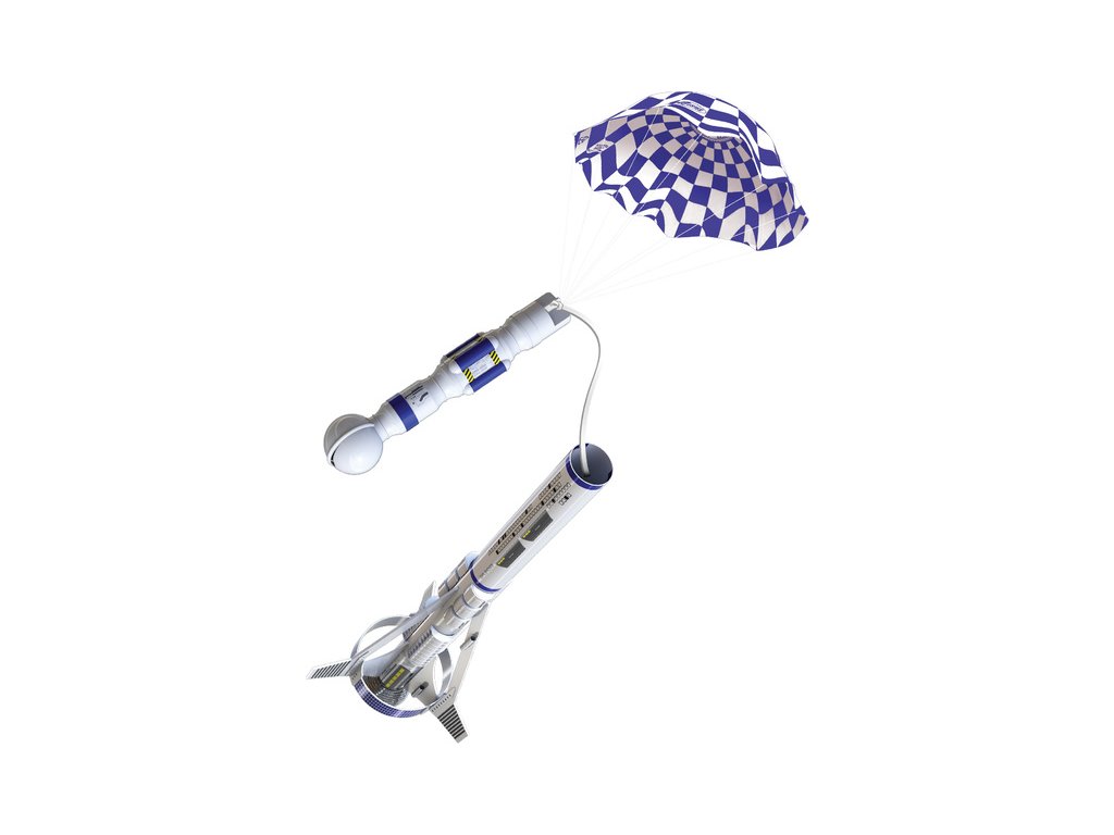 - Vrchol letu a výmet - po dohoření zpožďovací směsi dochází k zapálení výmetové směsi, která aktivuje návratový systém rakety.