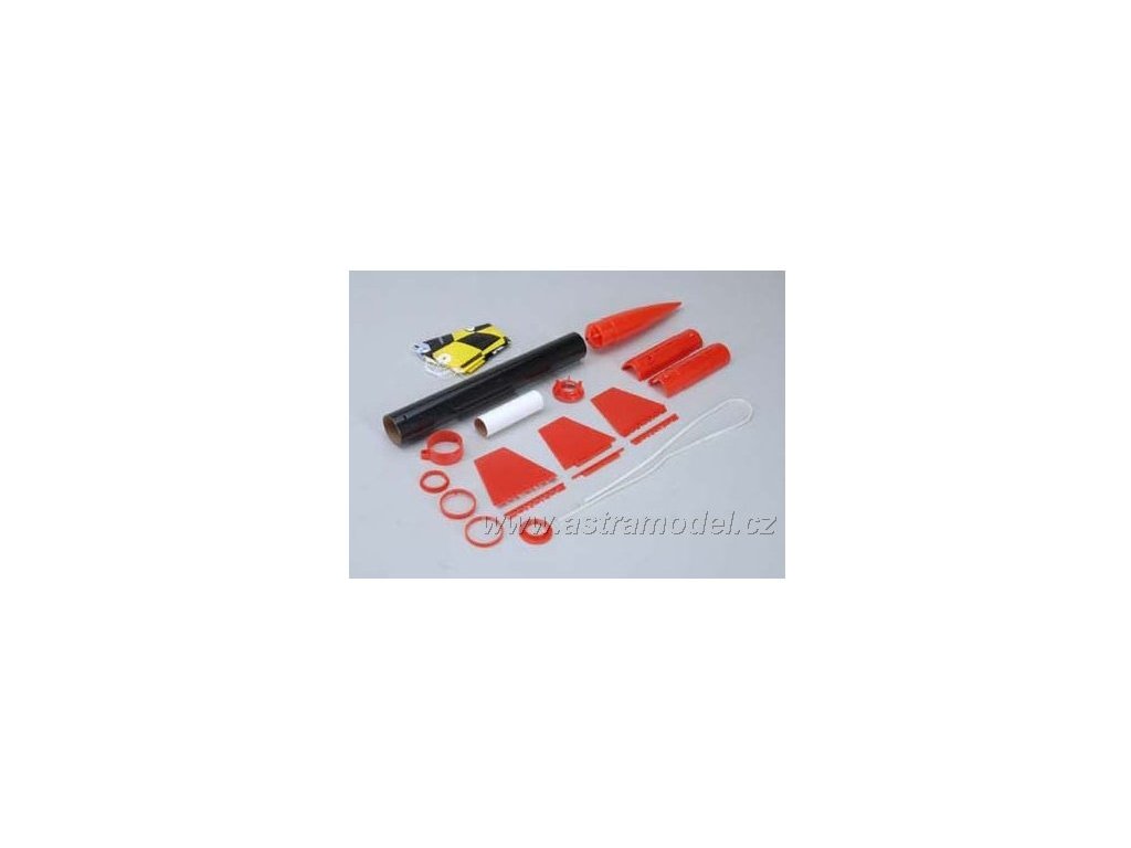 Balení obsahuje: tubus, plastovou špici, stabilizátory, padák, držák motoru, obtisky, obrázkový návod na sestavení. Návod CZ, manuál EN.