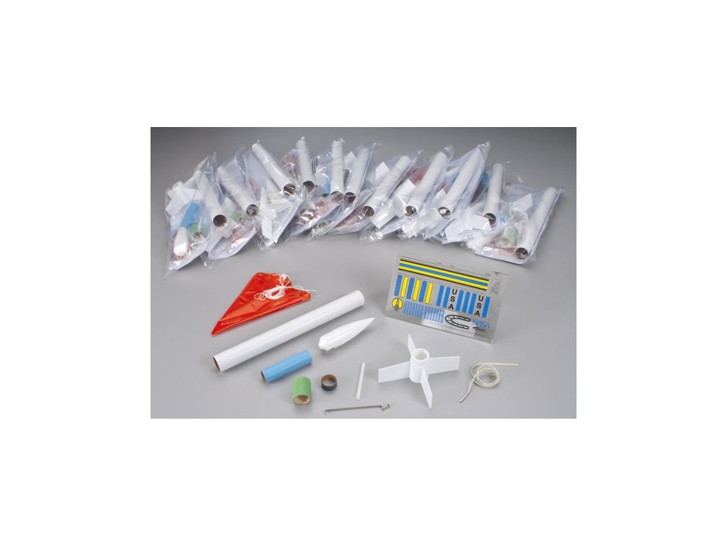 Balení obsahuje: tubusy, špice, stabilizátory, držáky motorů, padáky, pro stavbu 12 raket, návod CZ, manuál EN.