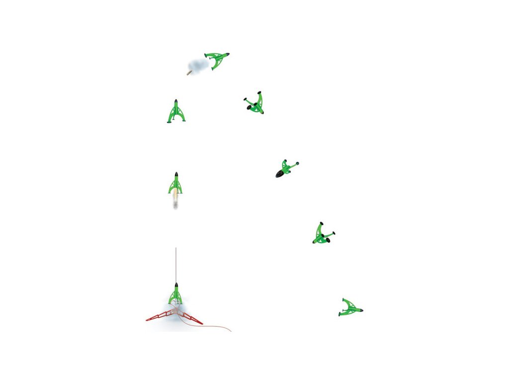 - Vrchol letu a výmet - po dohoření zpožďovací směsi dochází k zapálení výmetové směsi, která aktivuje návratový systém rakety.