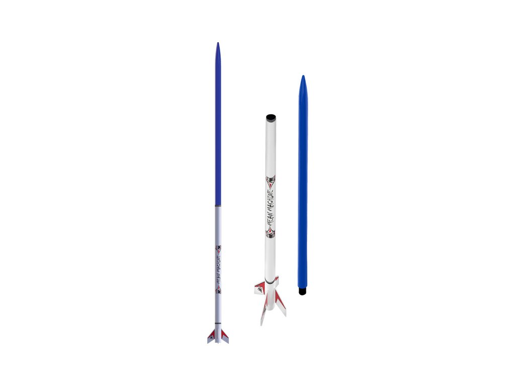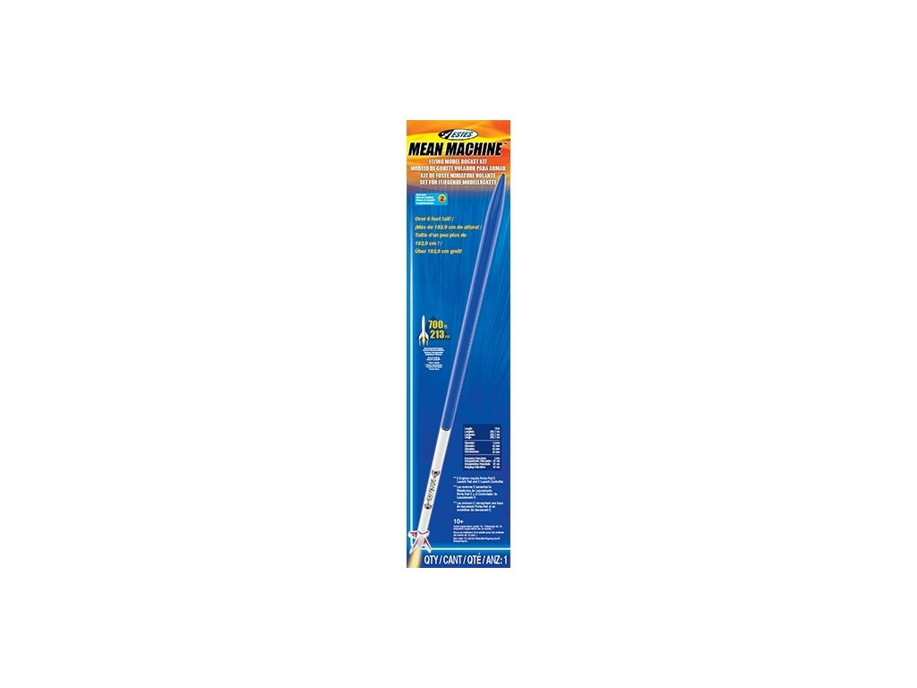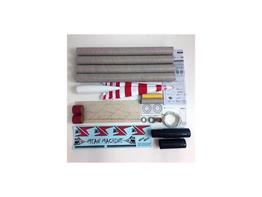 Model rakety Estes Mean Machine na raketové motory řady D. Mean Machine je více než 2 m dlouhá, létá do výšky až 270 metrů, k zemi se vrací padákem.