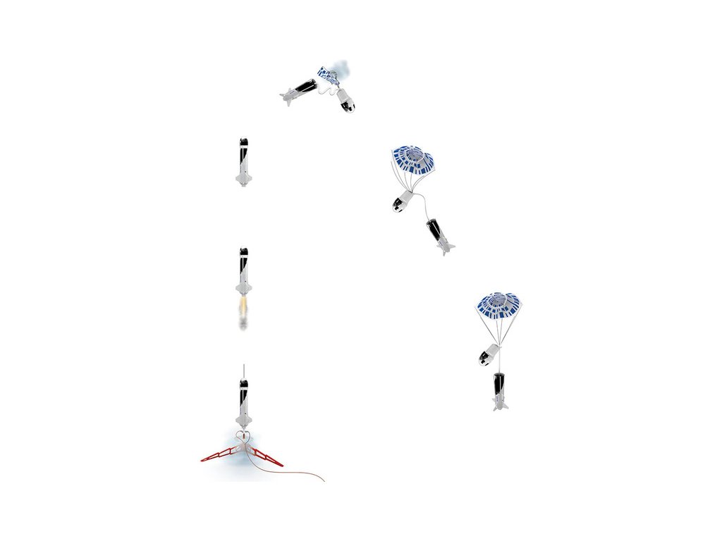 - Vrchol letu a výmet - po dohoření zpožďovací směsi dochází k zapálení výmetové směsi, která aktivuje návratový systém rakety.