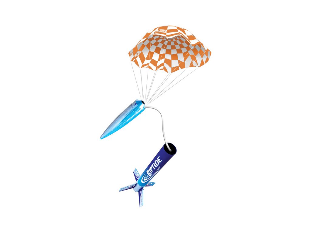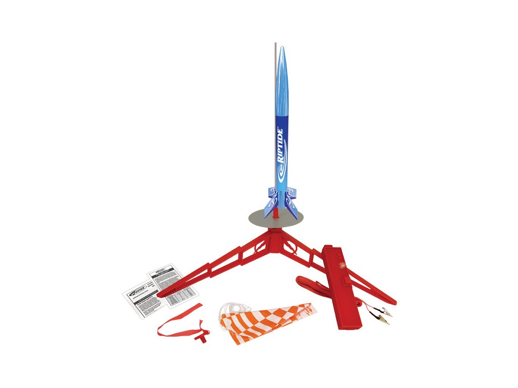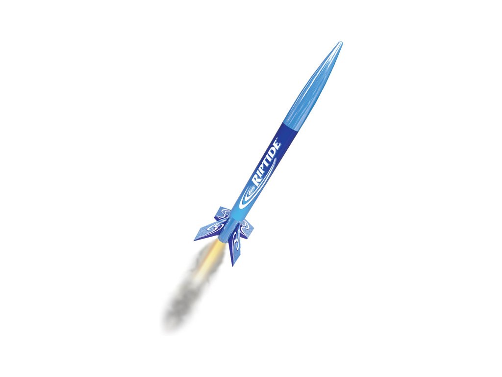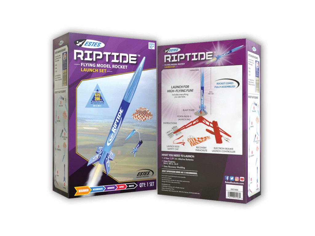 Model takety Estes Riptide je na raketové motory řady B a C. Riptide je hotový model rakety s odpalovací rampou a odpalovacím panelem připravený ke startu, který dosáhne výšky až 206 m! Ale nedělejte si starosti, že se ztratí v mracích. Snese se lehce k zemi na pestrém padáku.