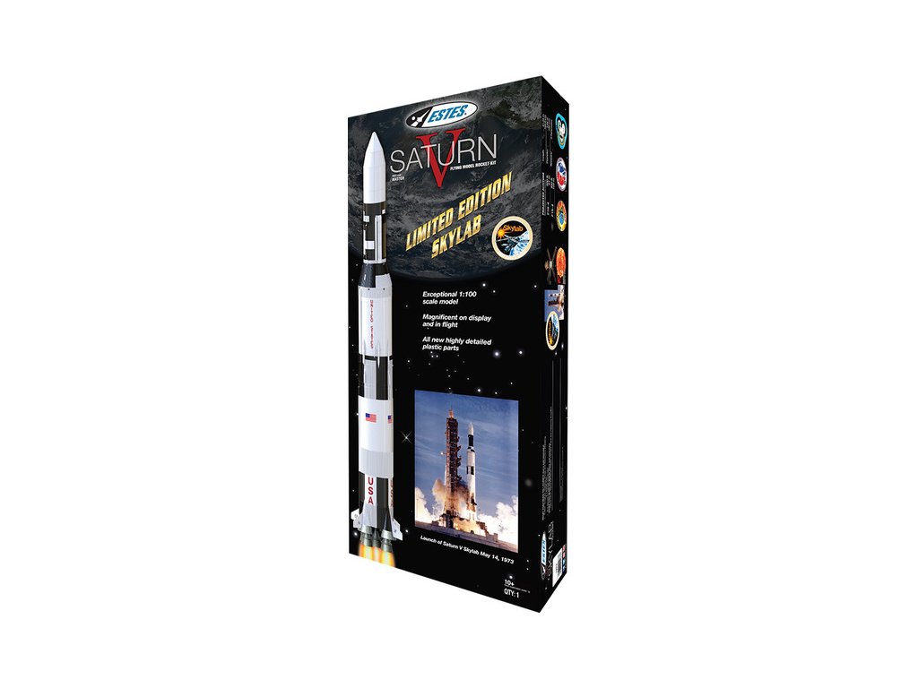 Estes Saturn V Skylab je přesná maketa této legendární rakety v měřítku 1: 100. Vakuově formovaný povrch tubusů a stabilizátorů dodávají povrchu autentický vzhled. Stabilizátory jsou přesné a maketové - k dispozici vodítko pro přesné vyrovnání a přesné umístění. Přiloženy jsou detailní obtisky. Před letem demontujte maketové trysky motorů. Při dosažení maximální výšky se raketa oddělí na dvě části - první a druhý stupeň Saturn V se vracejí společně pod dvěma 24 palcovými padáky, zatímco horní část Skylabu má svůj vlastní 18 palcový padák.