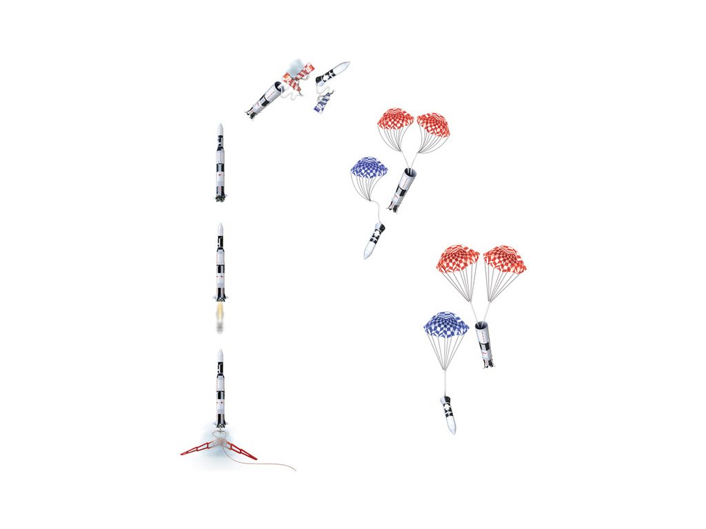 Balení obsahuje: tubusy, špici, padáky, držák motoru, stabilizátory, samolepky, maketové prvky, návod CZ, manuál EN.