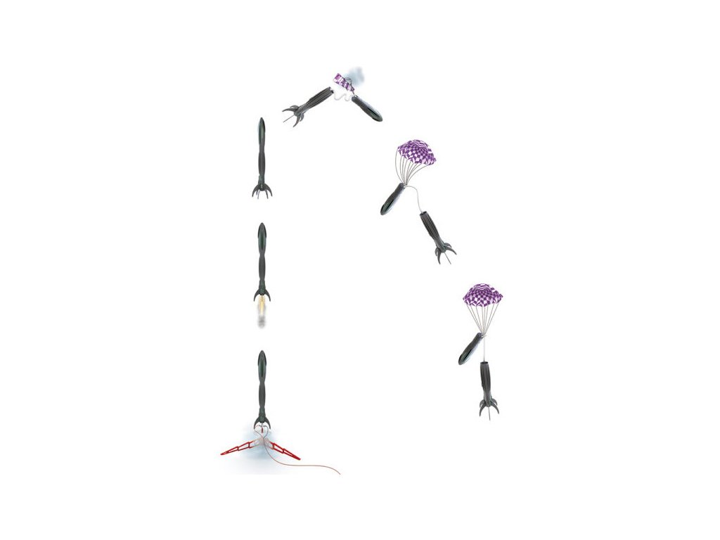 - Vrchol letu a výmet - po dohoření zpožďovací směsi dochází k zapálení výmetové směsi, která aktivuje návratový systém rakety.