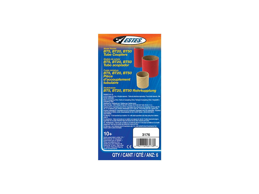 Spojky Estes na raketové trubky BT-5 ( průměru vnitřní 13,2 mm, vnšjší 13,8 mm ), BT-20 ( průměru vnitřní 18 mm, vnější 18,7 mm ), BT-50 ( průměru vnitřní 24,1 mm, vnější 24,8 mm ). V balení je 6 kroužků.