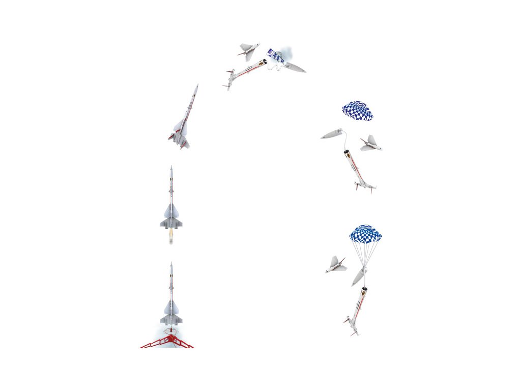 - Vrchol letu a výmet - po dohoření zpožďovací směsi dochází k zapálení výmetové směsi, která aktivuje návratový systém rakety.