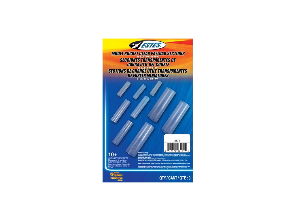 Redukce do trubek modelů raket - Estes - Vložky plastové čiré sada (3 x 3), rozměry BT-20 o průměru 18/18,7mm, BT-50 o průměru 24,1/24,8 mm a BT-60 o průměru 40,5/42 mm.