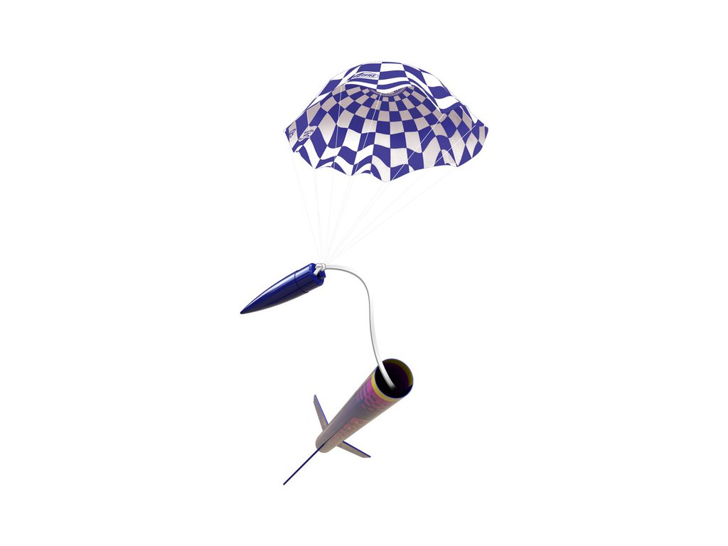 - Vrchol letu a výmet - po dohoření zpožďovací směsi dochází k zapálení výmetové směsi, která aktivuje návratový systém rakety.