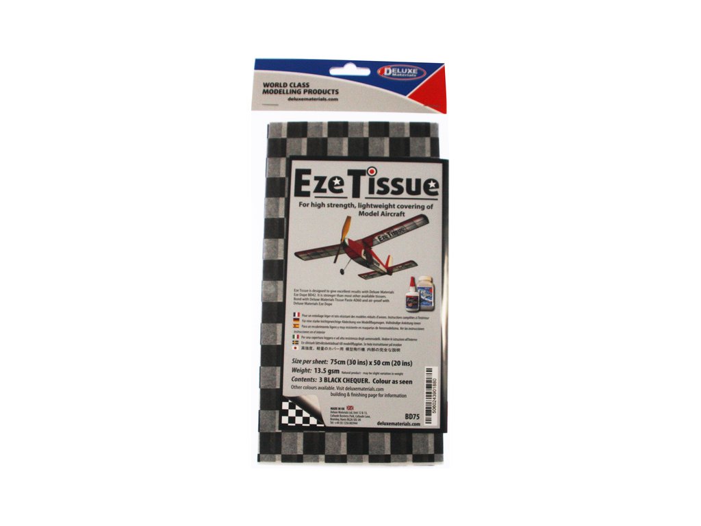 Eze Tissue potahovací papír 14 g/m², rozměry 75x50 cm, kostkovaný černý (3 archy v balení). Potahový papír je vhodný pro volné modely, retro historické a školní kluzáky, pro kroužky apod.