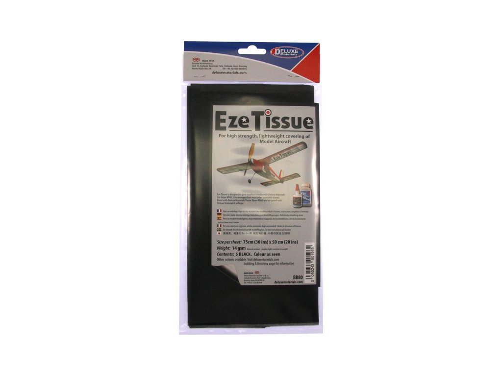 Eze Tissue potahovací papír 14 g/m², rozměry 75x50 cm, černý (5 archů v balení). Potahový papír je vhodný pro volné modely, retro historické a školní kluzáky, pro kroužky apod.