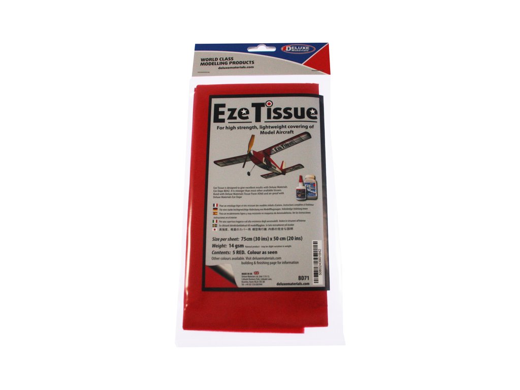 Eze Tissue potahovací papír 14 g/m², rozměry 75x50 cm, červený (5 archů v balení). Potahový papír je vhodný pro volné modely, retro historické a školní kluzáky, pro kroužky apod.