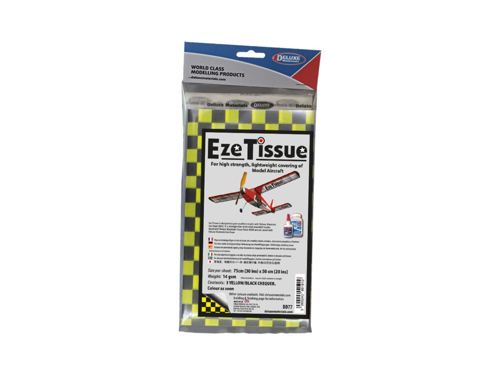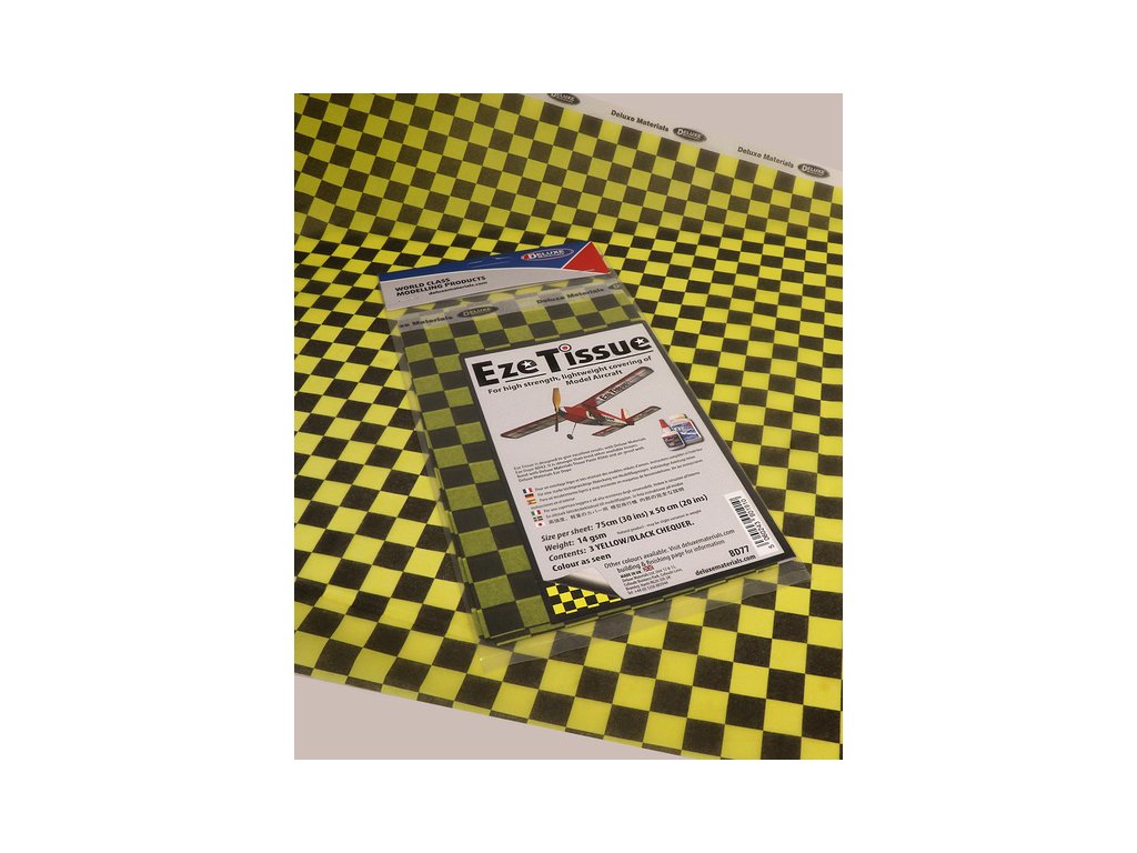 Eze Tissue potahovací papír 14 g/m², rozměry 75x50 cm, kostkovaný žluto-černý (3 archy v balení). Potahový papír je vhodný pro volné modely, retro historické a školní kluzáky, pro kroužky apod.