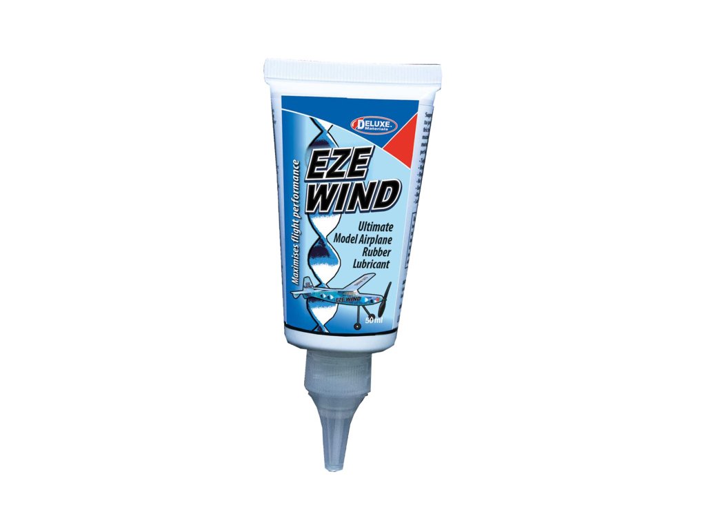 Silikonové mazivo Eze Wind od Deluxe Materials na gumové svazky pro modely letadel na gumový pohon. Přípravek výrazně snižuje tření gumy, prodlužuje se tedy dolet modelu přibližně o 15 - 20% a rovněž i životnost gumových svazků.